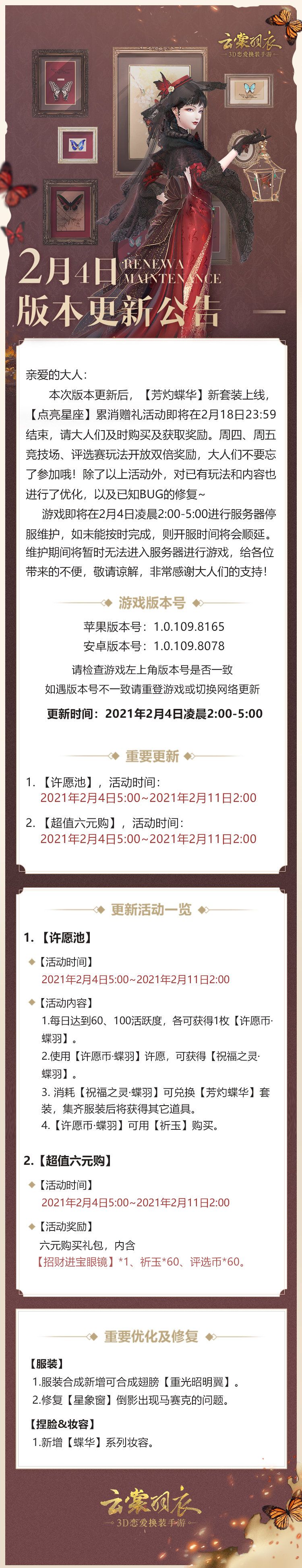 亲爱的大人: 本次版本更新后,【芳灼蝶华】新套装上线,【点亮星座】累消赠礼活动即将在2月18日23:59结束,请大人们及时购买及获取奖励。周四、周五竞技场、评选赛玩法开放双倍奖励,大人们不要忘了参加哦!除了以上活动外,对已有玩法和内容也进行了优化,以及已知BUG的修复~