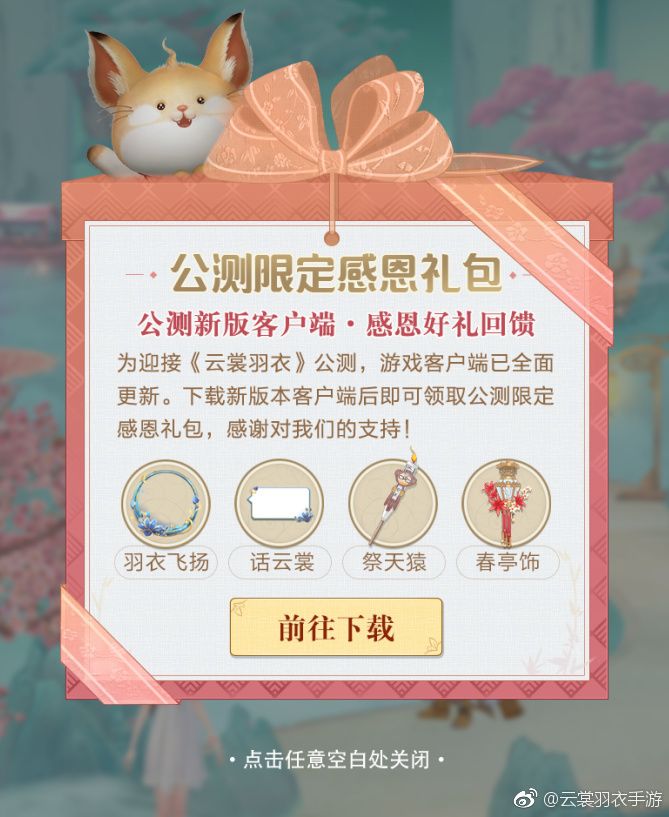 亲爱的玩家们,【公测安装礼包】活动现已正式开启啦!更新后的客户端保留旧版客户端游戏数据,不删除现有已注册玩家信息。从现在起到2018年10月29日4:00,安装新版本客户端并登陆游戏,即可在活动领奖界面直接领取【祭天猿】【春亭饰】【羽衣飞扬】【话云裳】奖励!快来下载安装新版本客户端吧!半半已经在新版本等着大家了哦!附官网下载地址:安卓:http://ysyy.qq.com/d/?devic