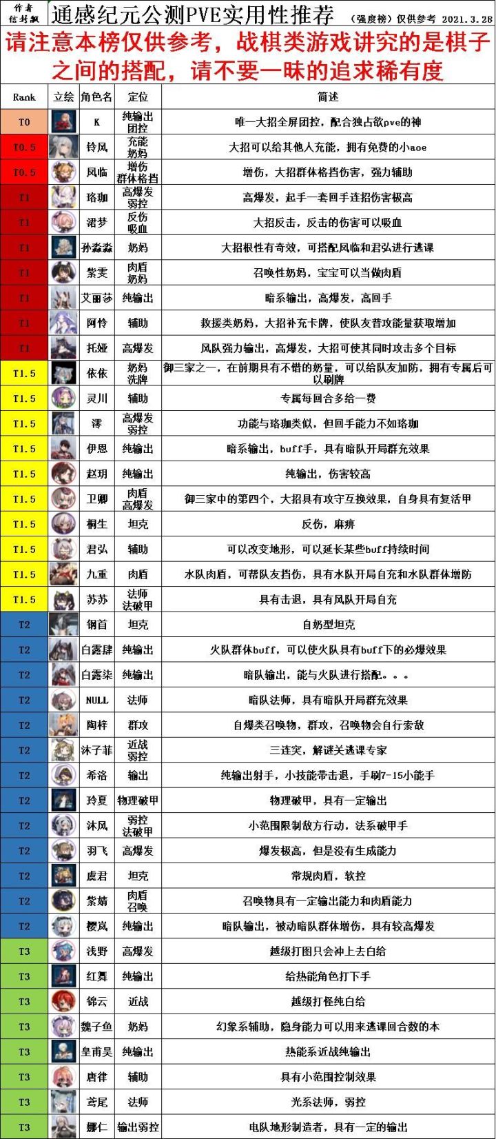 还是那句话。。。本榜单仅供参考,稀有度不是角色强度标准,战棋游戏讲究的是搭配和控制(老实说看你们一口气上四个mr真的好憨啊。。。养的起么)有辅助帮助的C才是真的C。如果你有不同见解或者精妙的搭配,欢迎留言,我回去尝试并对榜单做出修改。祝这个蹉跎了三年的游戏能有一个美好的未来,喜欢之前的那句话:临君之心,与君常在~本次更新为2021.3.28,更新内容为四个新角色和其他角色微调