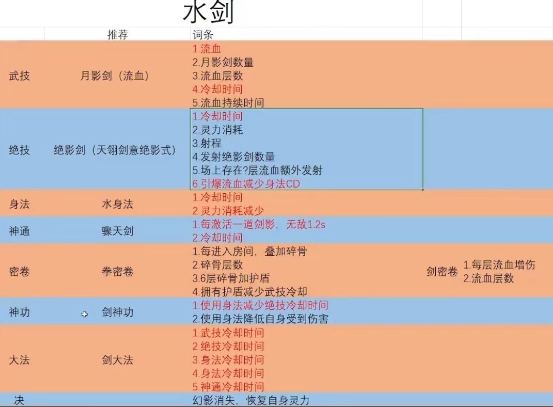 以下为攻略配置 先天气运 1鬼谷外门2噬魂剑3天翎剑意 关键词条 剑武技 月影剑 1 命中敌人时,30%的概率叠加一层流血 2 流血层数+3 3 流血持续时间+15秒 4 此技能的冷却时间-0.21秒 5 发射绝影剑数量+1 剑绝技 绝影剑(天翎剑意绝影式) 1每引爆一层流血,可使身法的冷却时间-0.71秒 2绝影剑发射数量+4 3场上有8层流血,额外发射绝影剑+3 4使用技能后,移速提升40%