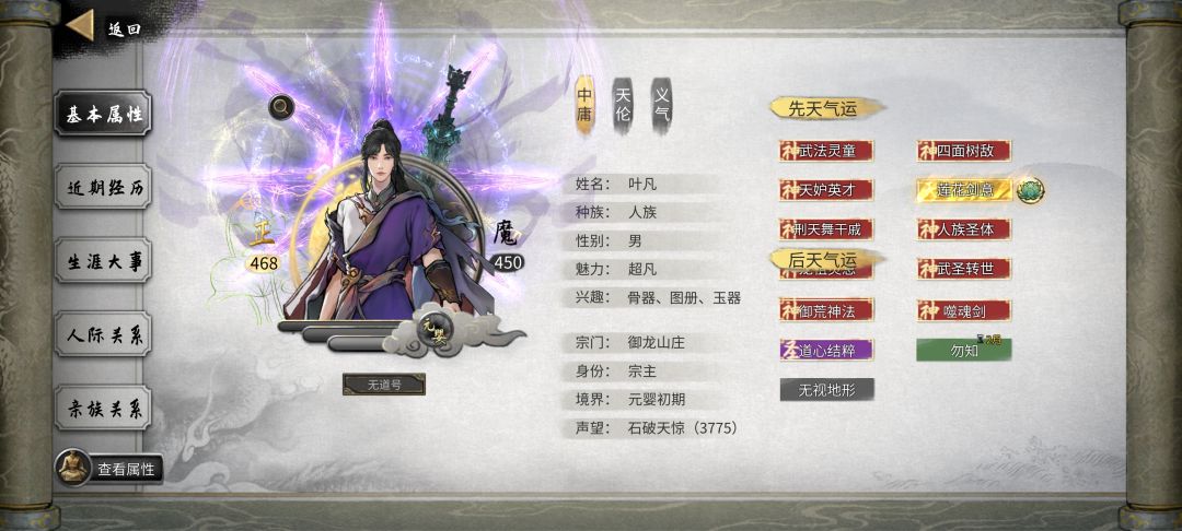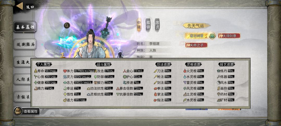 无论是想要满悟性或者满幸运,再或者是双满,这套先天是最优的,全是增益,没有任何负面影响。 这套先天拥有双满,高攻,高脚力,防御正常,灵力与念力可通过刷高(功法与灵根资质会略微少,但这些可以后天吃灵果刷到999) 想要修炼速度的可以把三清换成天妒 剑修的可以把阴阳眼换成莲花,或者把不想要的某个天赋换成剑痴或者是武器大师,再或者是两个都换上(其余流派均可依次类推) 觉得伤害不够高?很简单,把加幸运或者