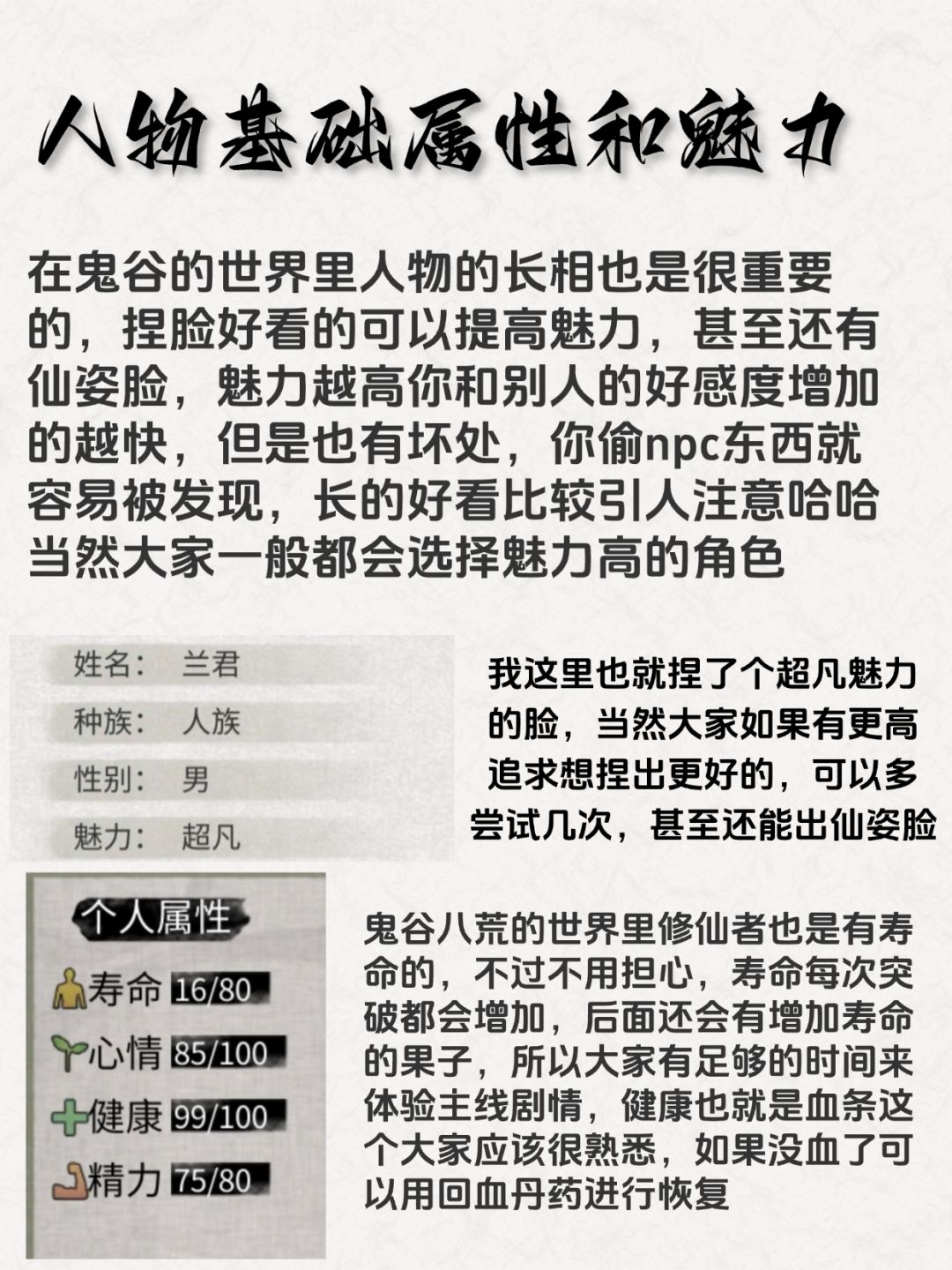 🌹在鬼谷八荒里,修仙者也是要有天赋的,各种资质也是很重要的,有些资质可以提升你修仙的上限,有助你修仙之路🌹 一、🌈人物基础和魅力 在鬼谷的世界里人物的长相也是很重要的,捏脸好看的可以提高魅力,甚至还有仙姿脸,魅力越高你和别人的好感度增加的越快,但是也有坏处,你偷npc东西就容易被发现,长的好看比较引人注意哈哈当然大家一般都会选择魅力高的角色 我这里也就捏了个超凡魅力的脸,当然大家如果有更高追求想捏