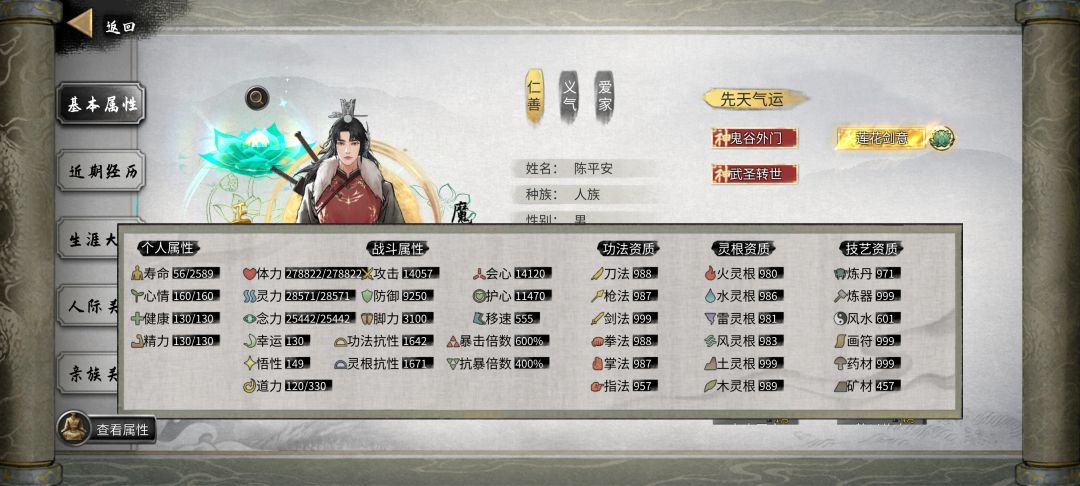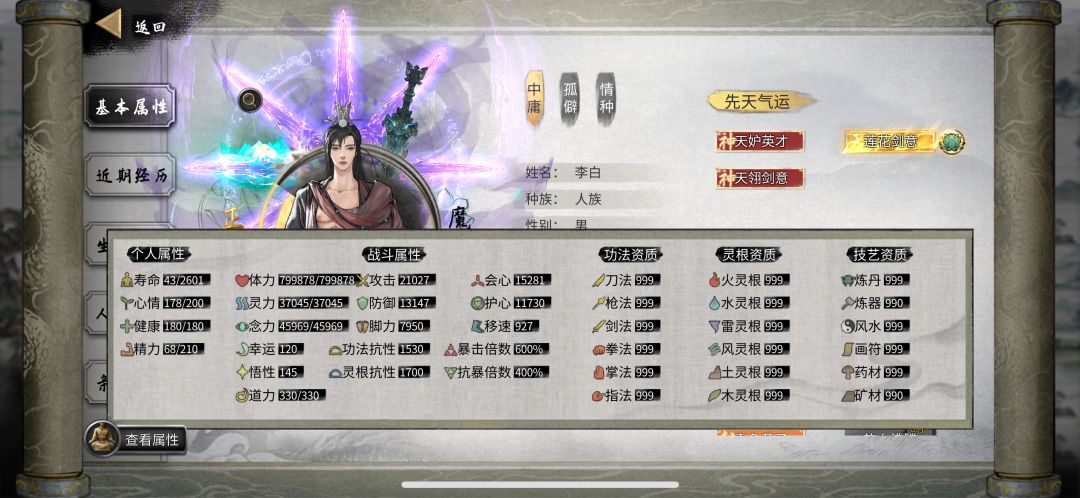 莲花剑已然大成,全心法完美词条,全红词条。 这是喝酒后的属性,就问你怕不怕 已然完美,但还不到极限 年龄加体力,再玩几年顺利破80万血 念力还可以更高,增加几个好友轻松46000 六仙法配置 五法宝装备 在纯剑这一块我敢言已然走在全服前列 就问你服不服[表情_看我的][表情_看我的][表情_看我的]#鬼谷八荒攻略 莲花剑选手可以收藏对照词条,这个词条我是从金丹开始弄的,界元石一路走到最后,完美词