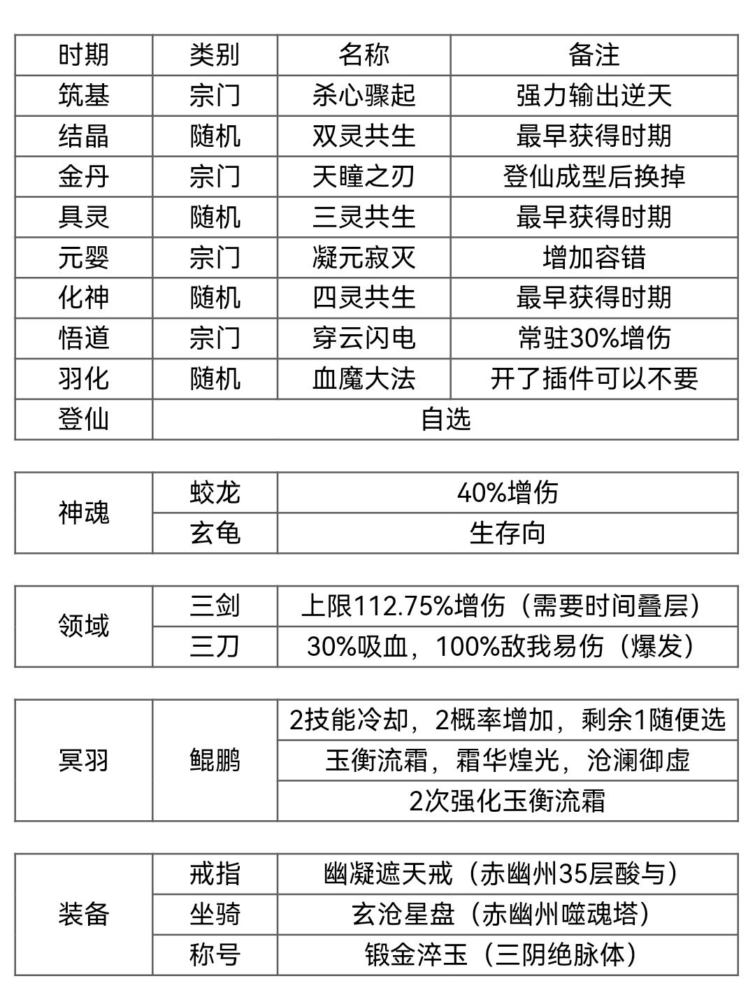 练气拿到棘刺术(蓝色就行)筑基无压力,这时期注意最大伤害是贴脸放绝技。难点是筑基升结晶,结晶后拿到红色武技绝技开始发力,当上宗主后,金丹境界用界元石搓一个剑大法小成,化神拿到四灵共生大成。前期打伤害基本都要贴脸,劲配得上境界的话很难靠天瞳刮痧,而且早期追踪弹也少。天瞳的作用是让你越境界打,不越境界天瞳就是白板。羽化初期加一身悟道技能能直接打到当仙盟盟主,打盟主不换掌法的话会被老登盟主用仙法直接斩。