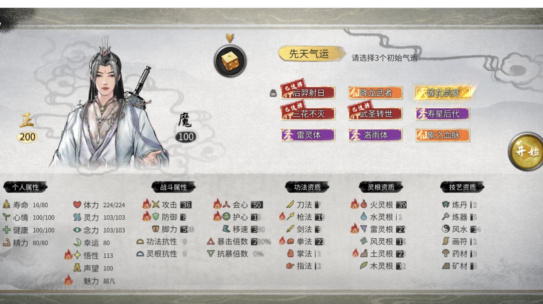 鬼谷八荒分为两个难度,前几个我称之为试玩版非常简单,洪荒难度一命通关才是正式版 新手初入洪荒那是相当难受(比如手残党的我) 现在就重新带你进入洪荒,不准跪,重新站起来 第一步:捏完脸后,先天气运选加攻击,其他都靠边站,有人说悟性,新人新手区都过不去要什么自行车,上篇介绍了性格的取舍这里不在赘述,直接选个仁善性格增加月结送东西(白嫖),双修(增加修为),论道(增加道心点)的几率……(先天选了个后