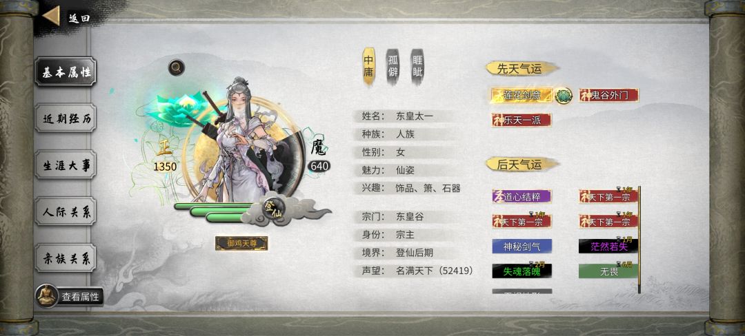 鬼谷洪荒模式难度很高(PC版更难,手游版降低了一些难度),前期出了剑开荒(因为绝技伤害高)舒服一点,其他的流派都在坐牢。 但我们可以拜师学艺,炼气拜结晶,筑基拜金丹等等跨阶段请教师傅。 首先拜师最重要的是性格,我们一般开局选*传承*就是为了这个,然后就是师傅的性格——*护短*最佳,*传承*很棒。*名声*,*孤僻*,*狂邪*尽量别理他们(很难成功)。 拜师要送拜师礼,给大家推荐一下(各种符咒、坐骑、