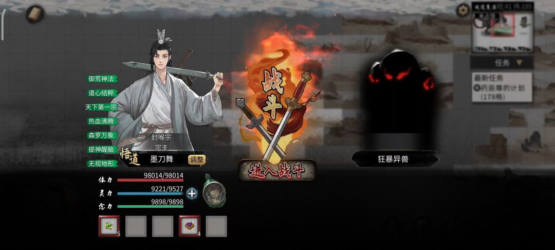 开局(假) 开了三个插件,不开也没影响 洪荒,NPC数量较多 先天 天妒英才:+%20修练经验,修练得更快,减少修练时间。 噬魂剑:噬魂剑吃了宗主后解锁的技能用绝技的时候它是有多少敌人它就会召唤多少把剑,所以打大妖兽的时候可以等大妖兽召唤小怪的时候再用绝技把小怪都打死,而这时候召唤出来的所有剑都会去攻击大妖兽。所以大妖兽召唤的小怪越多,剑能打的伤害越高。前期主要靠噬魂剑打伤害了。 武法灵童或者所有
