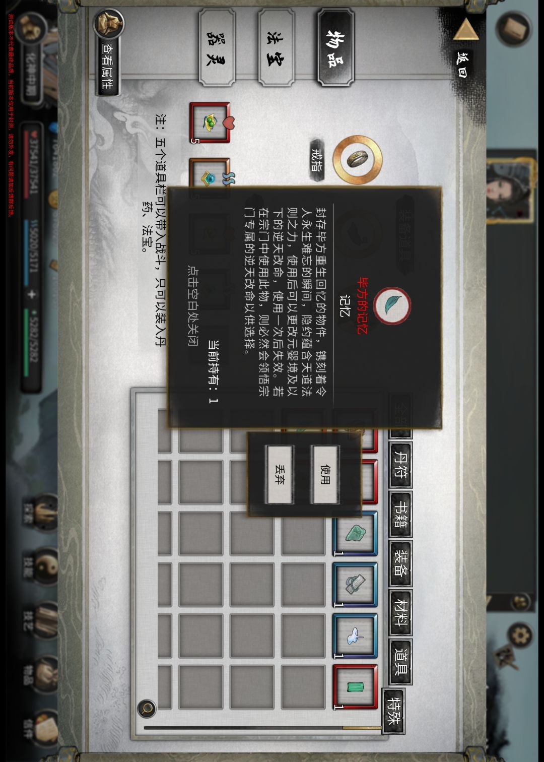 #鬼谷八荒攻略 《鬼谷八荒》是一款开放世界的沙盒修仙游戏,以下是一些新手入门指南: 1. 开局金色秘籍书:在游戏初期,玩家可以获得一本金色普攻秘籍书。这本书会根据玩家角色灵技或武技属性最高的数值给予相应的秘籍1。因此,在创建角色时,应考虑修炼的项目,确保主修项目的面板值最高1。 2. 隐藏的坐骑:在游戏初期,玩家可以获得一个隐藏的坐骑——一个葫芦。这个葫芦能无视地形,省去一笔坐骑费用,但需要筑基期