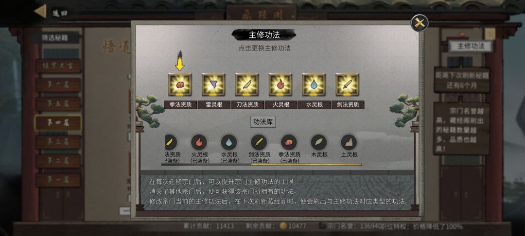 众所周知 洪荒难度下 无法通过回档来改变宗门功法 (不管sl多少次都是一样的结果) 那这样我们该如何通过宗门来获取我们想要的武技 绝技 心法呢?(该方法需要你是宗主) 在藏金阁内右上角有主修功法(如图一) 正常情况下,我们都是能选多少选多少的 可谓是宁可不用 不能没有 这样无疑是增加刷出我们心仪功法的难度 那么就很简单,只选我们想要的那个功法(如图二,我想刷带碎骨的拳武技)只选一个,其他都取消(如
