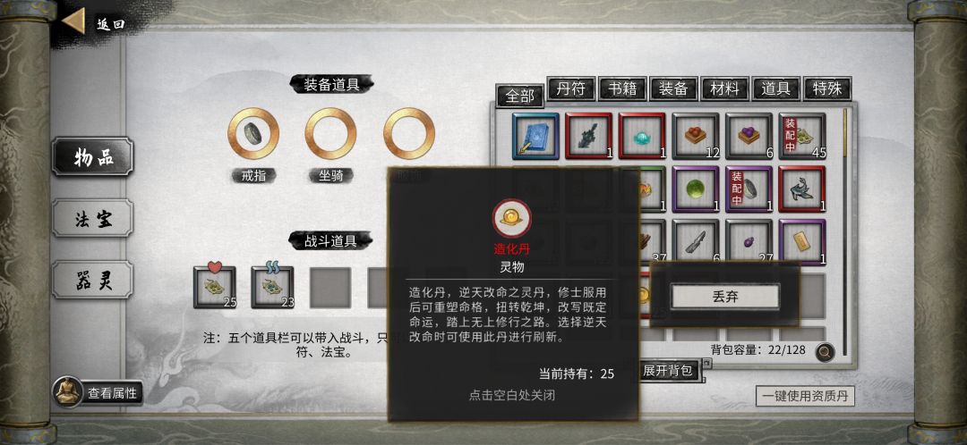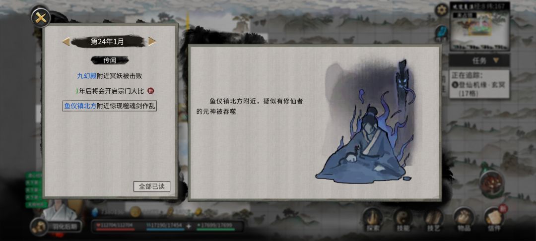 第一个档普通难度,npc数量中等。 看到攻略说有后天噬魂剑能获取,而且是更新后,就更新了,没有新开档,是更新后的旧档, 此时已经悟道 之后也没太在意,一直到羽化后期,突然有个传闻。 可以sl击杀后的情况,有能直接拾取的选项。 如下图,一开始是莲花剑意。 亲测可以吞魂。 因为已经是档的后期了,吞噬太费时间,结档时如下。 第二个档洪荒难度,npc数量极多。 这个档就是冲着噬魂剑去的,一开始没经验,第一