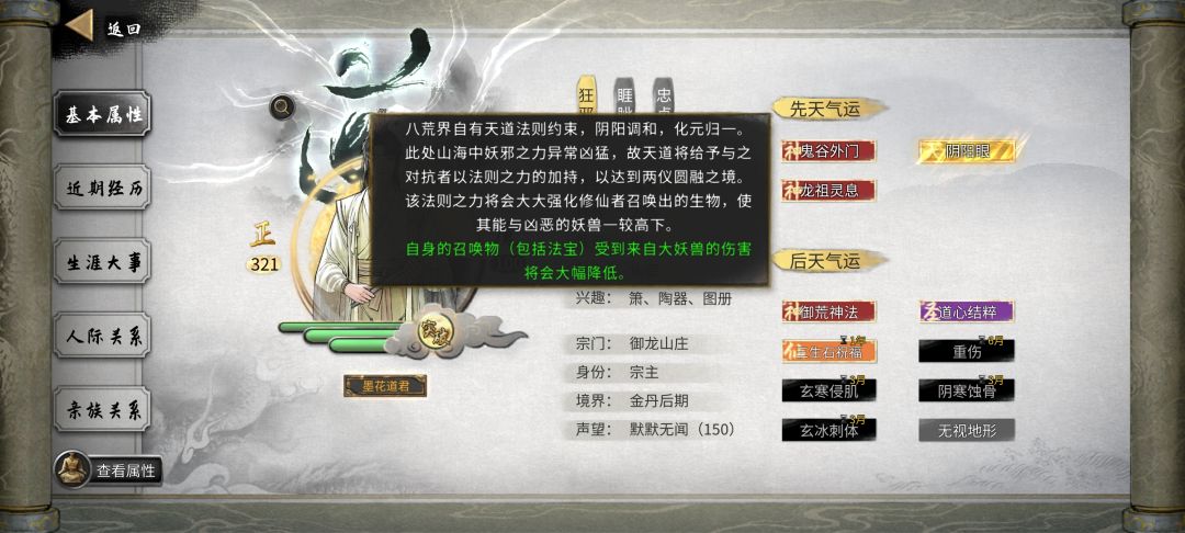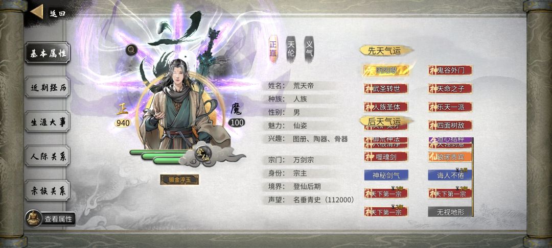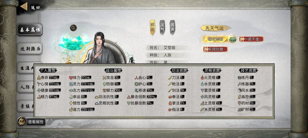 开局∶ 1 不是洪荒优先悟性,100以上,加自己想要的新的三个先天,洪荒要起码加5点攻击力或者加点防御,不然前面很坐牢,先天没那么重要,因为后期几乎没用,就是保证开局能玩的东西,悟性是为了学技能快,不然一个技能学几个月很烦。至于想玩的剑之类的资质也没必要强行刷最高再开局,不然一个开局roll点roll一天。捏脸开心就好,没必要开局就强行仙姿,魅力太高还有副作用,偷东西容易发现,过月一堆NPC烦人。