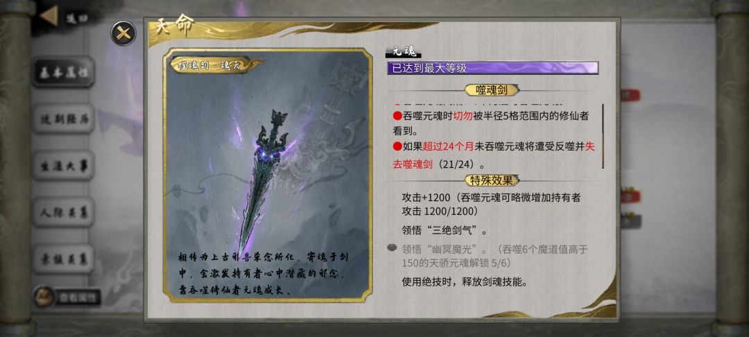 书接上回,前期不小心触发噬魂剑觉醒,拼尽全力也无法战胜 最后卡了一个技能任务才消停 为了救登仙便宜师傅,悟道期间一直双修➕闭关,16个月没有吞魂,噬魂剑开始狗叫,后面几个月一直狗叫:元魂。然后24个月就找你斗法,两个结果:它赢了你就没了,它输了它就跑了。(你就没有剑加成了) 这个时候就该回档,把噬魂剑喂圆满,然后没事走两步,它会来找你斗法,两个结果:它赢了你没了,它输了还在你手里(并且去除了2
