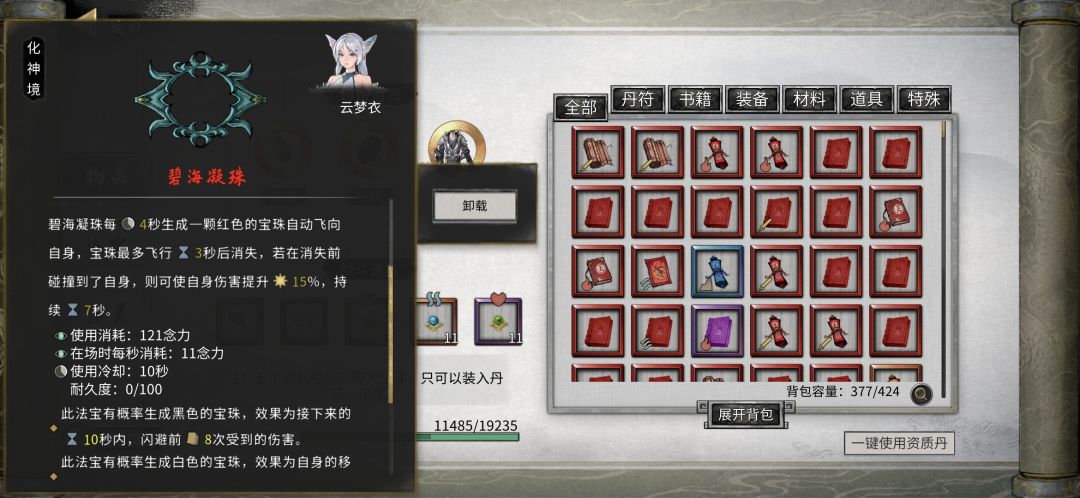 碧珠带狐狸,碧珠那个材料刷新就去打,升到登仙。楼主是清理背包不小心卖了导致现在珠子还是化神。 古琴带东方 技能各位道友可以看看。 双开法宝提供超高额的回复和增伤效果。兼顾回灵回血增伤闪避增加移速。东方技能效果平a概率减对面输出,回灵的时候回八倍血量,累积损失百分百生命值,且血量低于百分之三十回复所有状态并提供百分之十增伤。狐狸技能常驻增伤。且提供召唤物增伤。和碧珠增伤球非常的契合。 且法宝都可以突