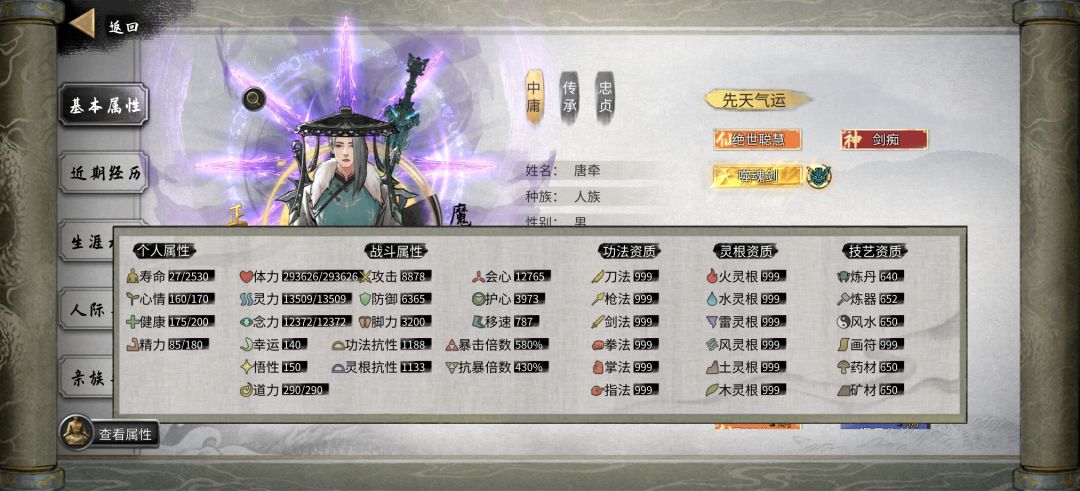 1到元婴一定要把所有功法搞到最好,刷的比较累,核心词条都是完美的,尤其是火密卷、剑大法、剑神功,截图是登仙境界的,但都是用界原石把元婴的核心词条复制过来的。醍醐宝典没用过,反正元婴成型了,密卷、大法、神功就一直没换,到登仙才换的。 2逆天改命核心:天地同寿、杀心骤起、血魔大法、血灵大法。天地同寿配合火狐数量,打坐着的横天时候,直接贴脸放身法、绝技循环,横天血量都没出现,就被秒了。剩下三个都是运气不