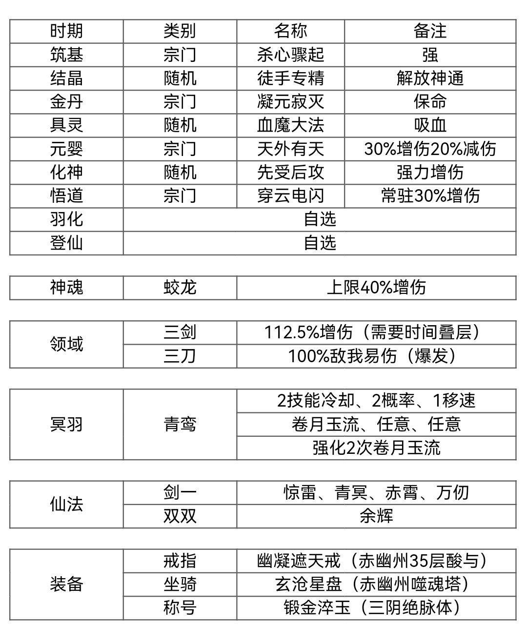 声明:说的不好不要骂我,我也是萌新已经160个小时了好几个档天天玩因为热爱所以想写,欢迎补充。 先说逆天改命,这个东西真的特别特别重要 ,少一个就很难玩,九个逆天改命可以说固定死了。杀心骤起 ,前期宗门获取(最好筑基第一个逆天改命就刷出来) ,血灵入门 ,血魔入门,地火明夷 ,五个跟屁虫。 绝技真龙破,武技前期用穿心矛 (后期只要不登山就可以换碎骨拳,眩晕加拳神功可以叠爆伤),火神通,火身法,