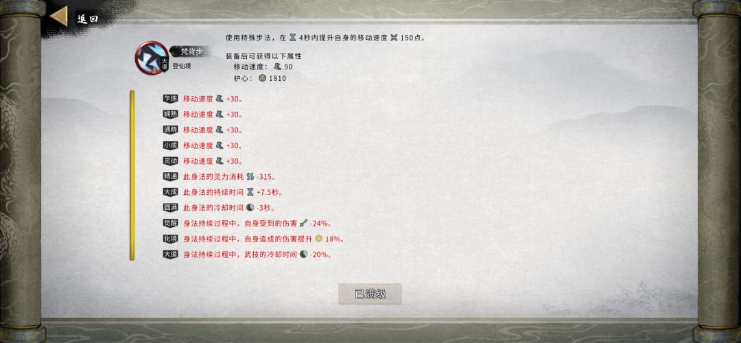 洪荒攻速刀,不沾火密卷,不用火身法,不靠火增伤,不需要换道心,通过心法+技能+冥羽形成100%攻速+100%减伤+高增伤完美闭环。 ps:首推掌身法(步),图片可以看到掌身法非常契合刀修,加移速(弥补我们吃不满穿云电闪的增伤空白),有减伤,有增伤,不断普攻,有减CD,无缝衔接二次身法(火身法断普攻而且落点到处串) 【100%攻速】 掌身法20%减武技CD+剑大法25%减武技CD+武法精通40%减武