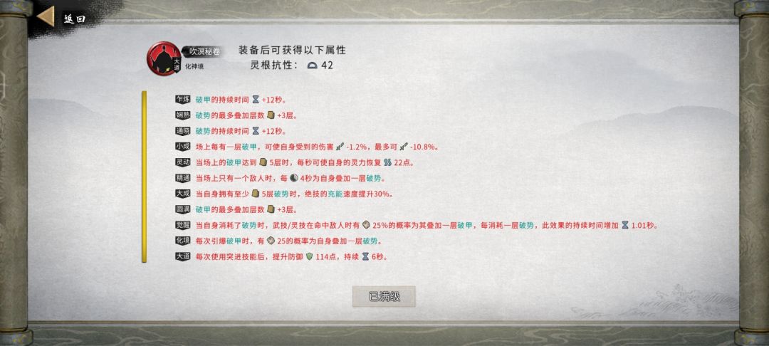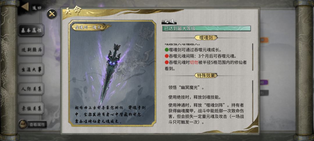 直接上图。 兜兜转转打到悟道了,也终于是把噬魂剑塞满了。不愧是顶级天赋,真的很强。 在噬魂剑满元魂之前,每两年噬魂剑都会来要求你吃一个魂(我没有试过如果不给会怎么样,可能会遗失吗?) 噬魂剑有两个元魂等级。0-50填满之后会升级一次,然后再填满500就会到上限。 但是,填到上限之后走一步就会触发【噬魂剑噬主事件】,会要打噬魂剑本体(而且你的噬魂剑加成全部失效),噬魂剑本体强度大概是悟道升羽化的大妖