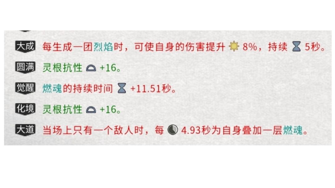 1.不带封面这个生成烈焰团加伤的词条,或者不刷满 要知道火增伤是本游最大轮椅,火增伤栓条狗都强;火增伤就建立在这个词条之上。 可以说没这个词条就没火剑这个流派,这得把它供起来。 它的最大数值是8%,请务必参悟刷满。火秘卷上其他的词条捆一块都没它金贵。 2.武法系逆天拿满。 火剑不靠武技输出,武技的效果只是叠加流血。 由于火身法形态的问题,火狐奔跑的时候武技是停掉的,身法落地之后需要近半秒才能成功叠
