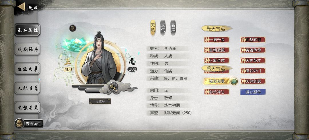 先天气运:鬼谷外门、人族圣体(或者武圣转世)、阴阳眼(整活) 神器:炼妖壶 练气到元婴突破材料个人采用全暴击倍率突破。 完美蓄力可以打开游戏音效来听,当然听到再松手已经晚了,主要是听一下找节奏。 纯掌没什么保命的技能,刑天一阶段比较难躲,要做个琴法宝(带有回血词条以及神通变奏)过一阶段。 练气:武技只有青涛掌,绝技随便选一个 筑基:武技有排云掌了,绝技惊虹掌,当长老学个归神掌。山挥要小心,心法不达