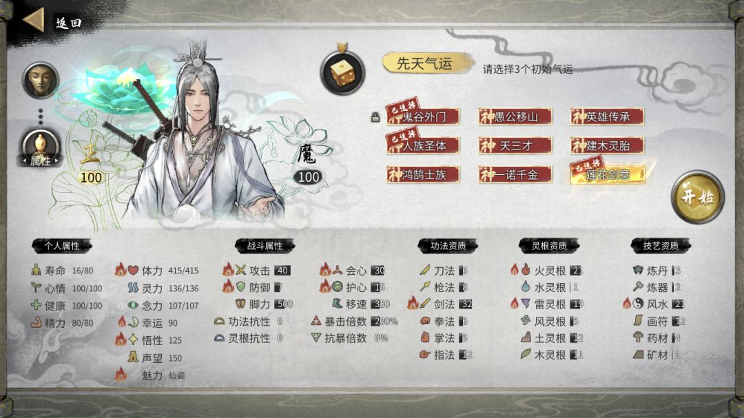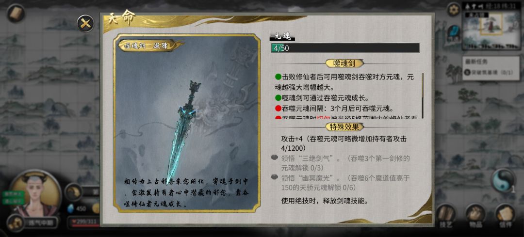 新手攻略,保命为主,老手可以跳过 1.先天气运选择 噬魂剑 (最适合风剑的异人天赋,技能全开以后补足了风剑的输出问题,必选) 鬼谷外门(稀有词条,建议锁定这个词条去刷另外两个) 武圣转世(稀有词条,攻防悟性,可以方便的渡过前期 嫌麻烦不想刷的也可以选其他加攻击力的词条) 2.锁鬼谷外门刷噬魂剑的时候看一下悟性,悟性尽量高一点,初始悟性尽量在80以上(加上鬼谷外门给的30是110) 3.法宝选择昊天