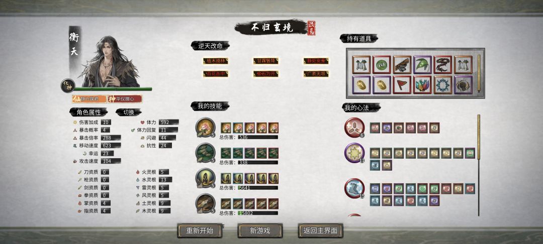 #鬼谷八荒 #鬼谷八荒dlc攻略 最近才发现出了手机端,果断入手。不归玄境开始玩着没意思,后来很上头,挺适合打发时间。本来打算每个角色都写一下,全通后发现有通用套路和规律。跟大家做个分享吧,也算对游戏的暂别。打不过去的老铁可以参考。 一、按角色先天气运和神通来搭配技能和心法。如:夜雨楼吸血效果-100%,就别选吸血相关了,以此类推。 二、洪荒怪难打,前期要走位聚怪,初始技能选冷却快不蓄力的。正常前