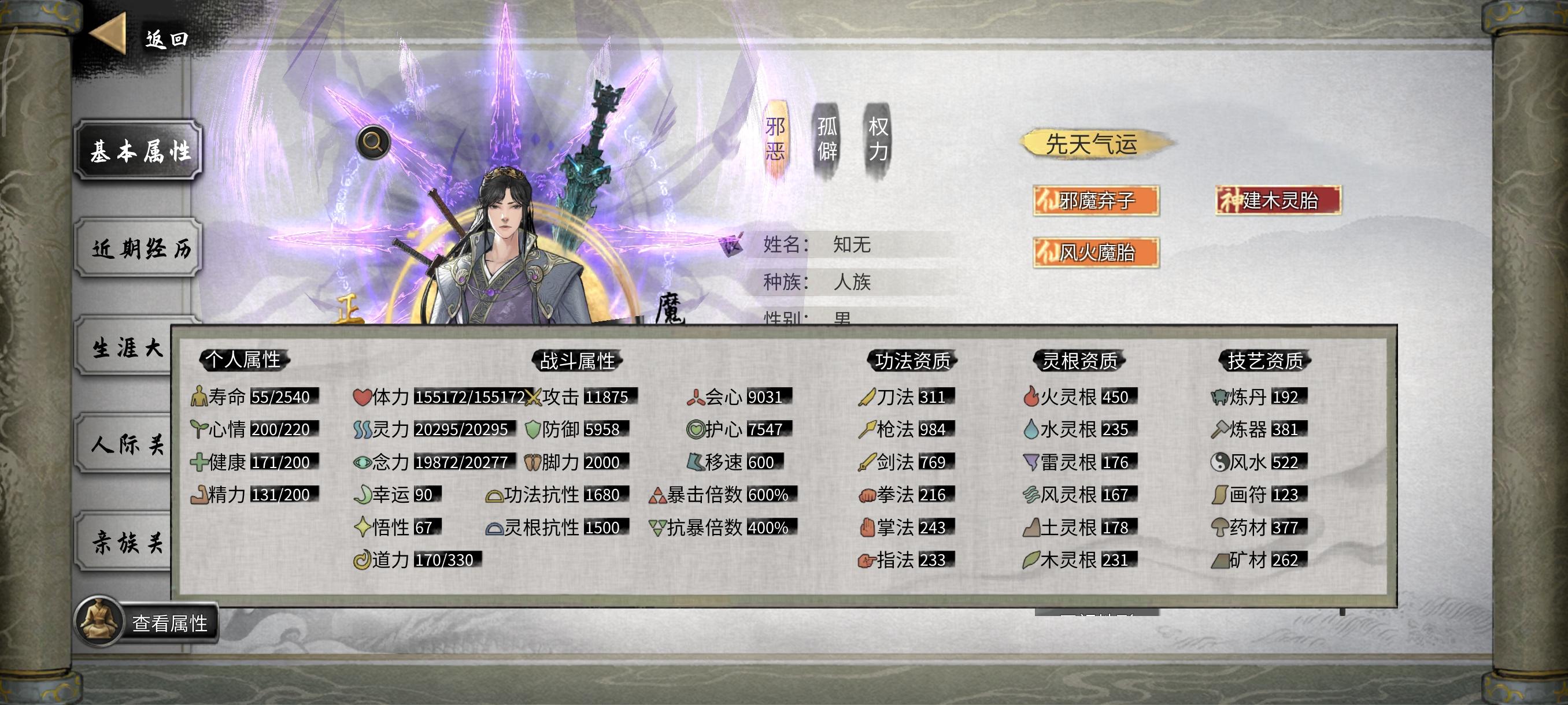 ★手游插件开满 (不开会很肝很肝)★洪荒开局(但是记得存档,死亡一次要回档,否则会被强行删档,只能重开。基本拿了噬魂剑,和天香的“帝花道君”游戏就变简单了。实在没信心可以选普通玩,其他难度不建议)★建议选最多NPC的选项 ,更多互动,也方便找Bug功法★天命气运介绍:★青莲剑仙:产生各种功能的莲子,强在资源获取,伴生技能需要配合剑系功法。主要是再也不缺复活药了,不需要为了亲友去学什么三生九