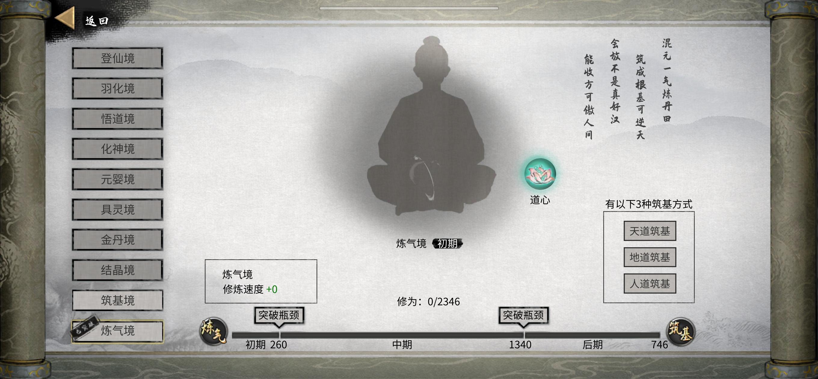游戏已买入一年,走图频繁弹窗跳月,筑基期还没有突破 字太小了 不像网游一样点击自动跟随然后今天入宗门买一品丹因念力不足300(本身209)无法使用,刚买的时候因到处找到处跑 磨人心态,一年后回归因念力提升 不知道在哪里 系统也没有提升如何提升念力。总之不玩了