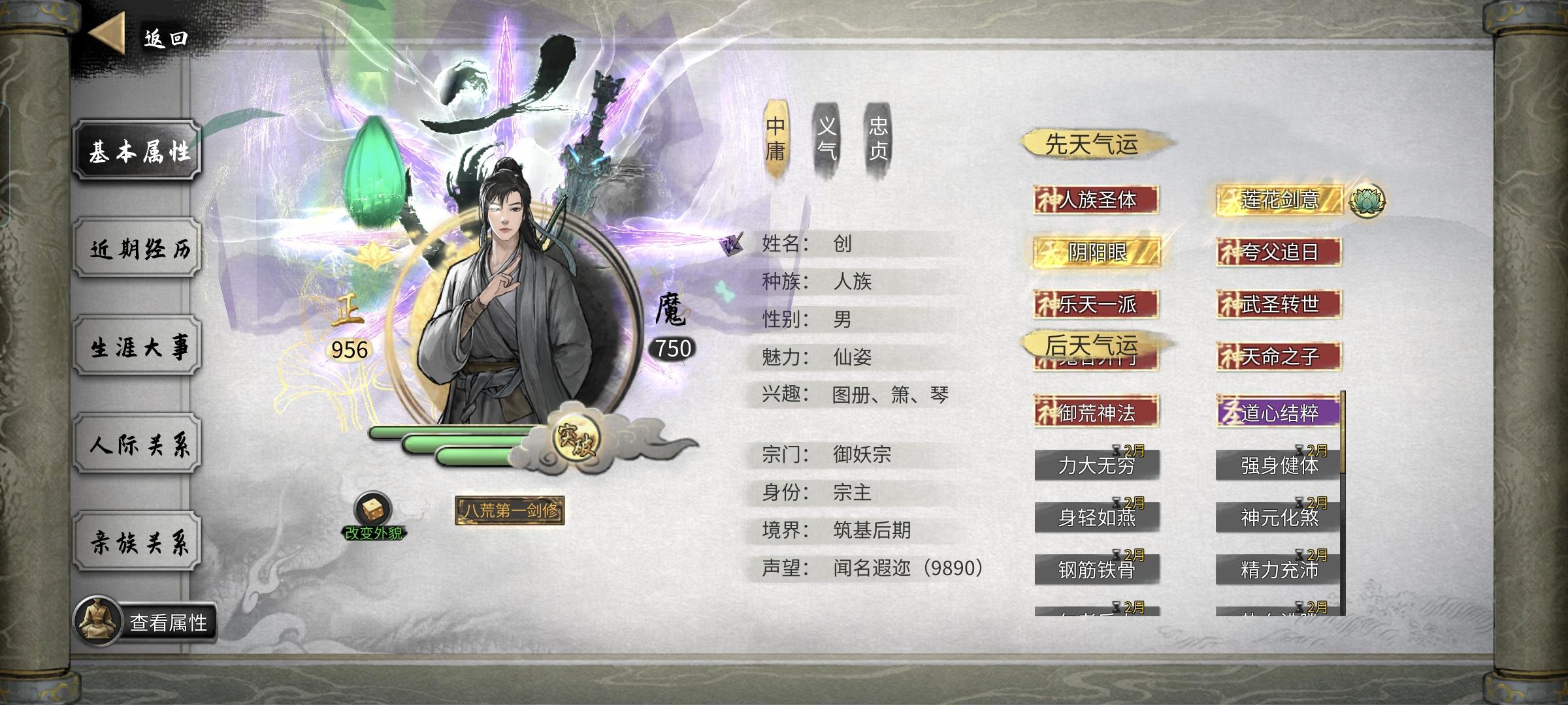 ★手游插件开满 (不开会很肝很肝)★洪荒开局(但是记得存档,死亡一次要回档,否则会被强行删档,只能重开。基本拿了噬魂剑,和天香的“帝花道君”游戏就变简单了。实在没信心可以选普通玩,其他难度不建议)★建议选最多NPC的选项 ,更多互动,也方便找Bug功法★天命气运介绍:★青莲剑仙:产生各种功能的莲子,强在资源获取,伴生技能需要配合剑系功法。主要是再也不缺复活药了,不需要为了亲友去学什么三生九