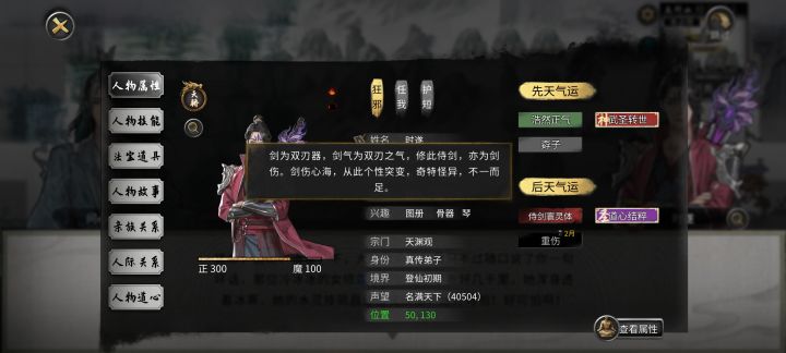 打开游戏第一步,点击主页左下角,把插件全部开启,开启爽玩模式。性格:开局性格选择仁善/中庸,➕忠贞传承。好人性格,方便结交好友,结缔亲族关系,还不至于无私那种烂好人,过月麻烦多。先天气运选择:莲花剑意和阴阳眼这两个金色的先天气运不论功能性还是面板强度都是顶中之顶,必拿,噬魂剑可以后天获得,不选。鬼谷外门,武圣转世,人族圣体为性价比三件套,攻击悟性都有,属性管饱。武法灵童和六根不净加12种流派