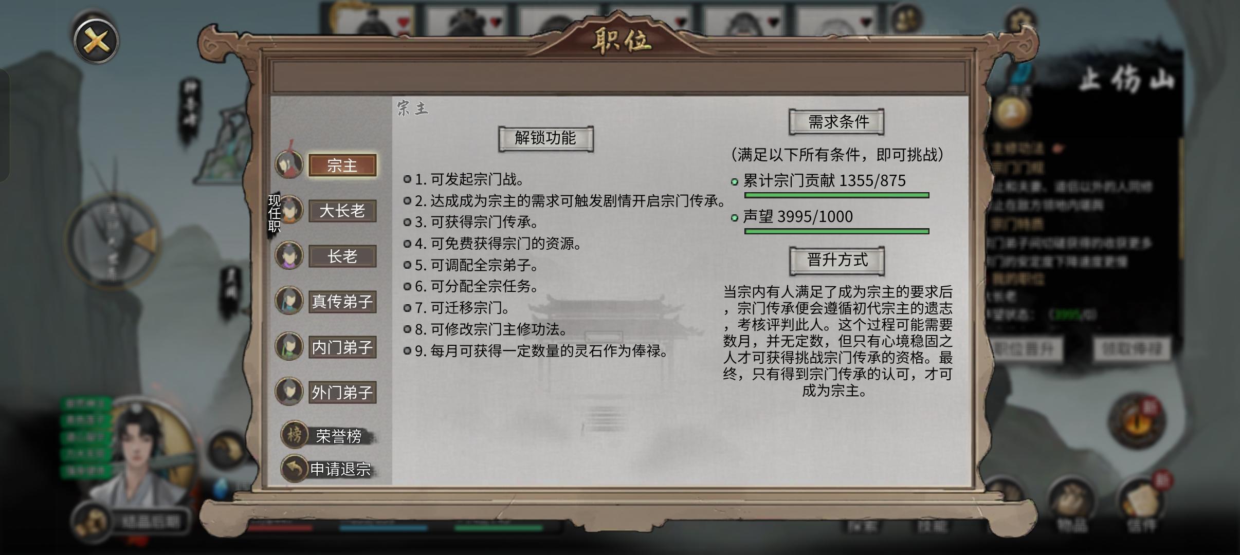 如题,任务栏有成为宗主任务,职位晋升没有挑战选项,开了两个档都是这样