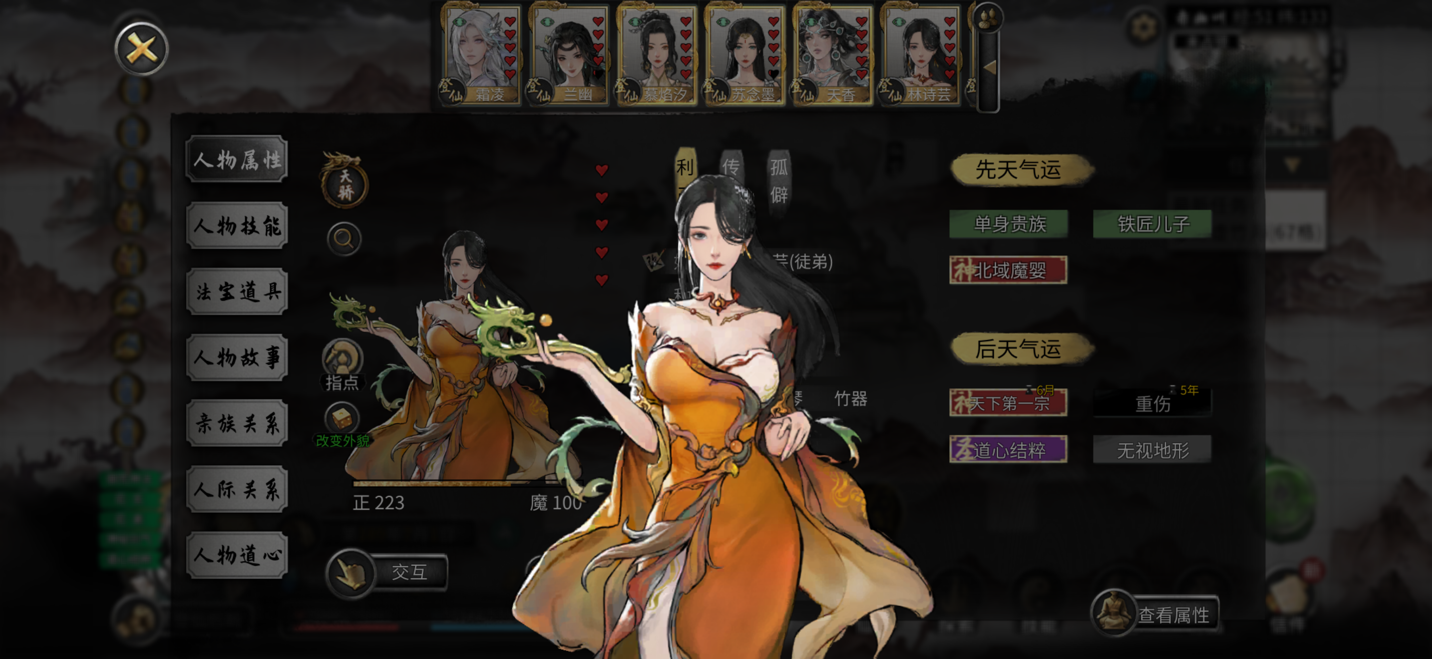 1、义气、正直性格的化形壶妖不参加宗门大比,其它3个中庸天伦忠贞的化形壶妖也不参加。2、玩家搬迁到赤幽州的宗门天生矮其他宗门一截,人数格子少了几十个。 其他在暮仙州有分舵的宗门,它的格子是有一大堆格子的,没有分舵的是10个真传、5个内门、5个外门的。如图1为宗门示意图,暮仙州开局就只有4个宗门我也不知道什么回事。图2为苍雪殿(赤幽州总部)人数格子部分图,它有10个真传位,70个内门位,50