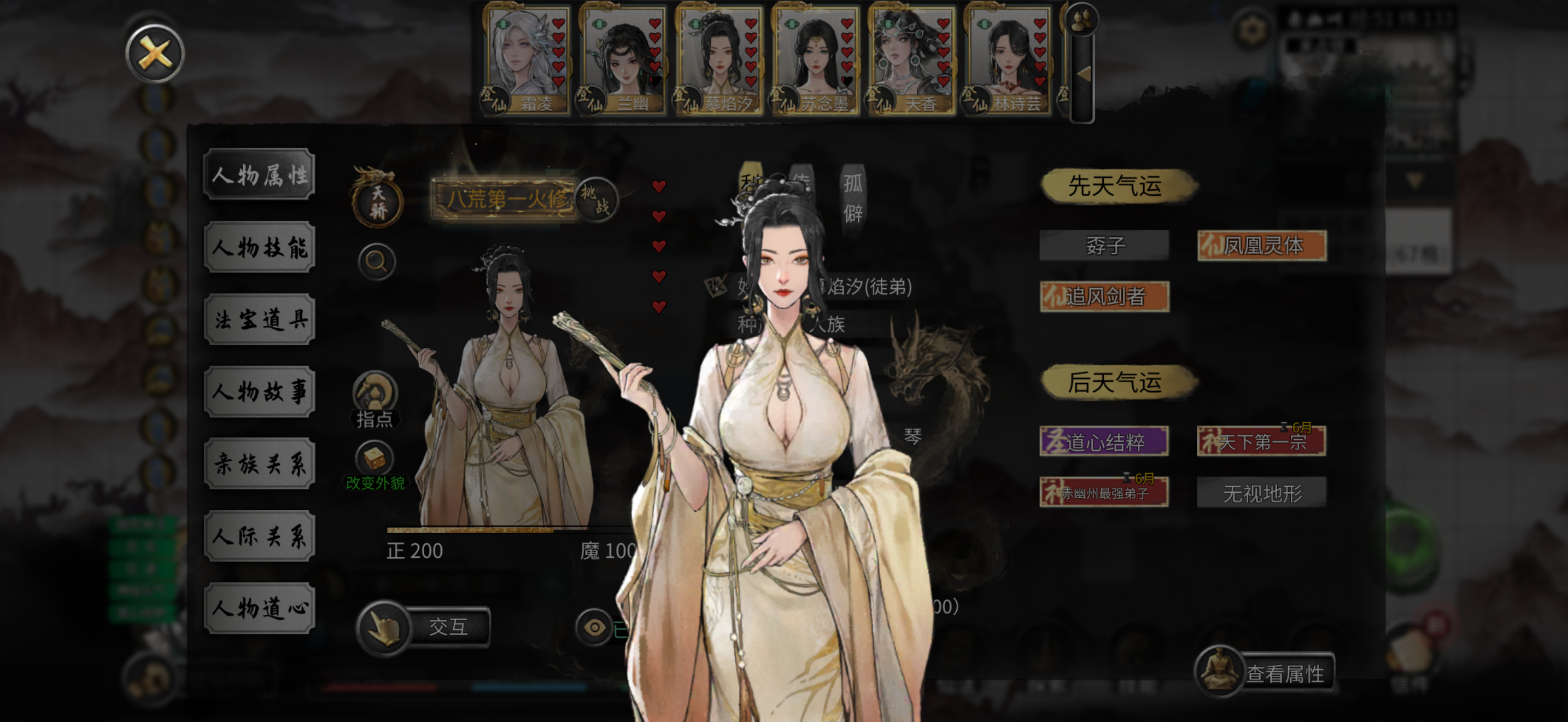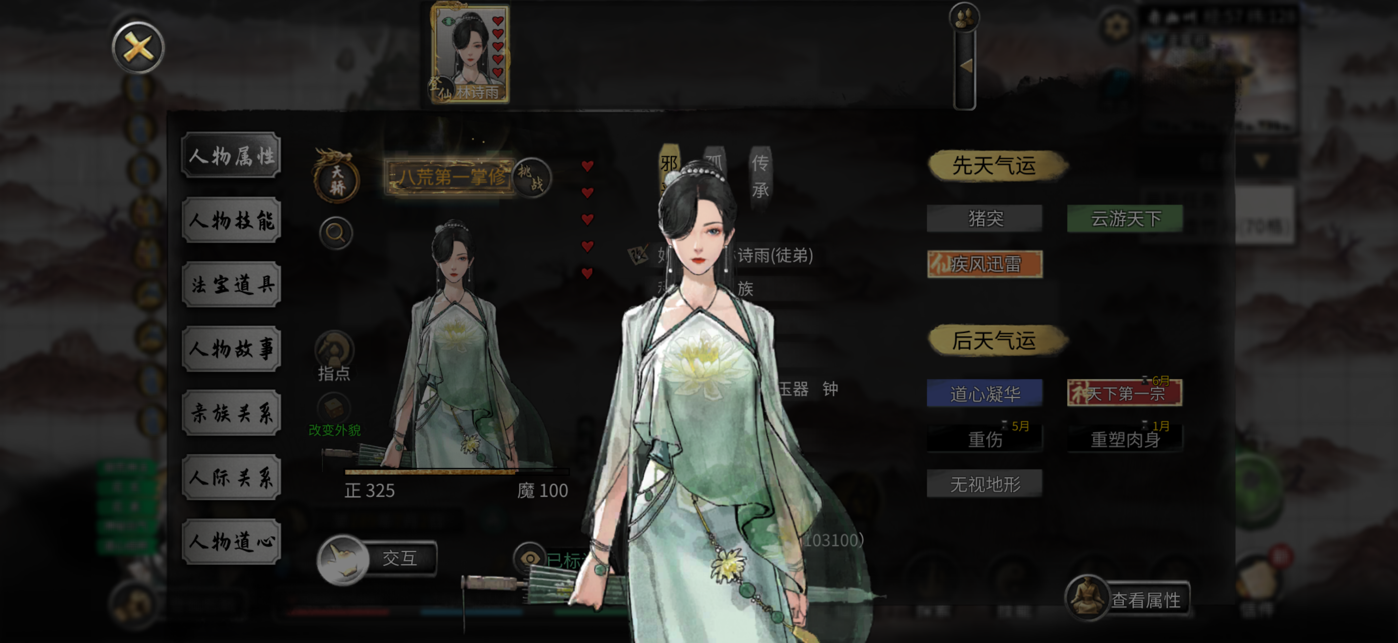 ★手游插件开满 (不开会很肝很肝)★洪荒开局(但是记得存档,死亡一次要回档,否则会被强行删档,只能重开。基本拿了噬魂剑,和天香的“帝花道君”游戏就变简单了。实在没信心可以选普通玩,其他难度不建议)★建议选最多NPC的选项 ,更多互动,也方便找Bug功法★天命气运介绍:★青莲剑仙:产生各种功能的莲子,强在资源获取,伴生技能需要配合剑系功法。主要是再也不缺复活药了,不需要为了亲友去学什么三生九