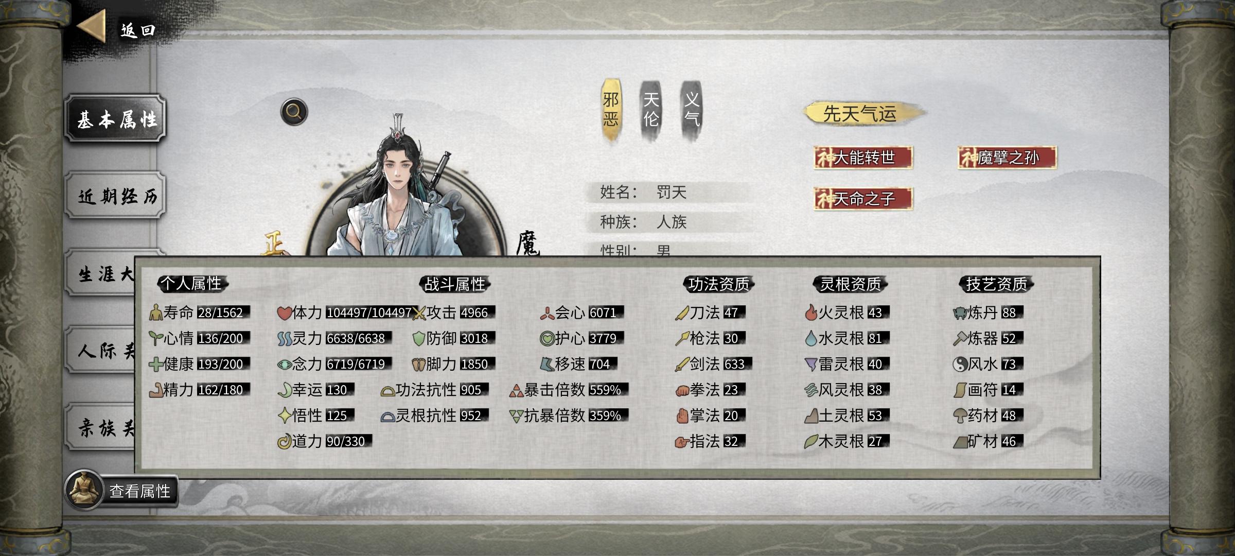 ★手游插件开满 (不开会很肝很肝)★洪荒开局(但是记得存档,死亡一次要回档,否则会被强行删档,只能重开。基本拿了噬魂剑,和天香的“帝花道君”游戏就变简单了。实在没信心可以选普通玩,其他难度不建议)★建议选最多NPC的选项 ,更多互动,也方便找Bug功法★天命气运介绍:★青莲剑仙:产生各种功能的莲子,强在资源获取,伴生技能需要配合剑系功法。主要是再也不缺复活药了,不需要为了亲友去学什么三生九