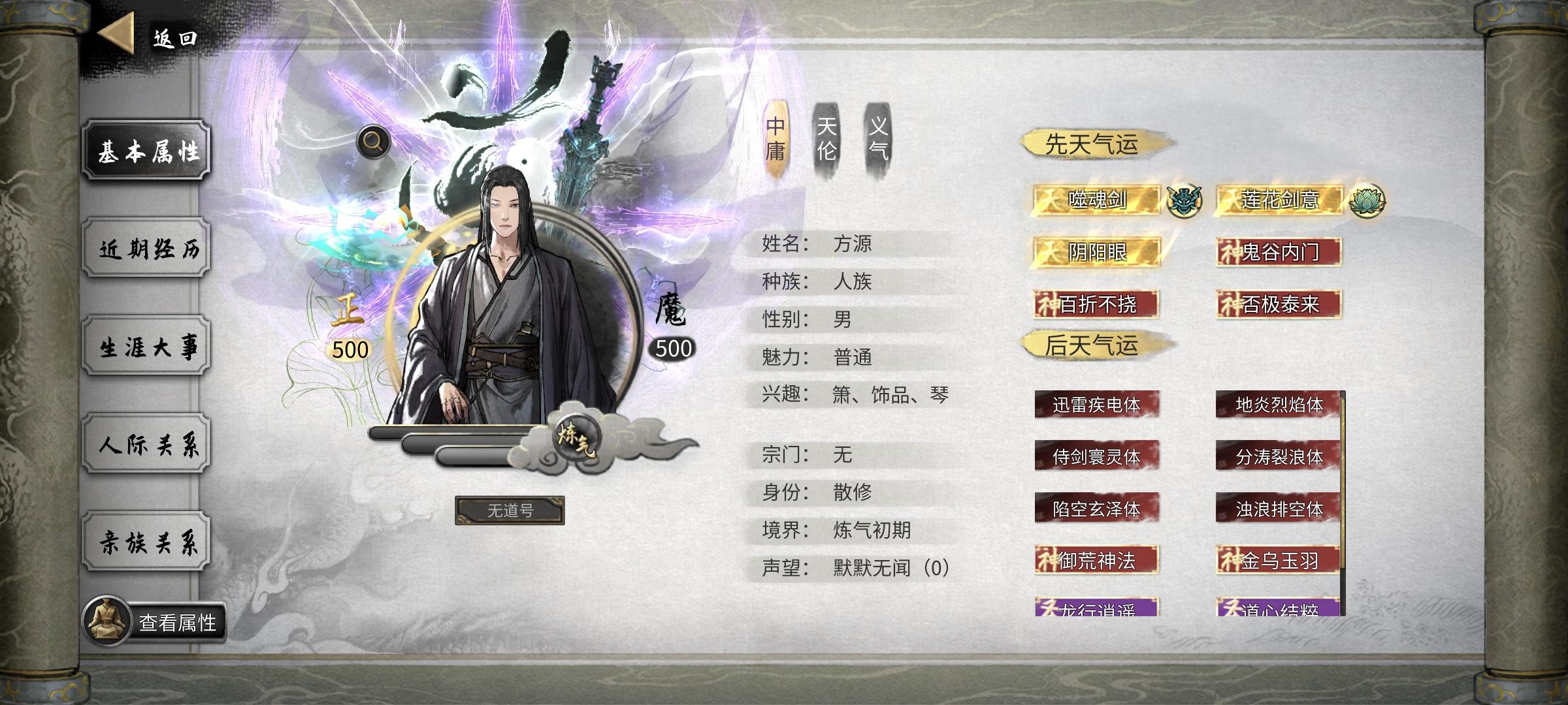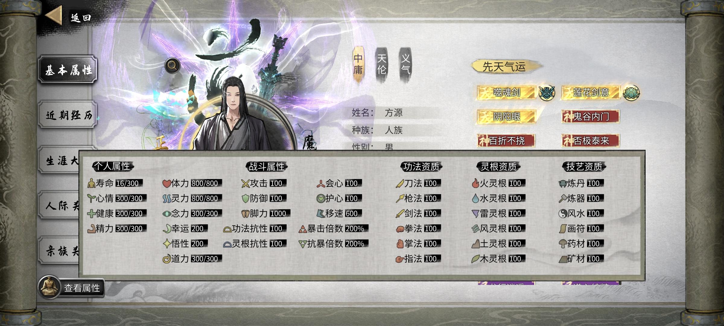 ★手游插件开满 (不开会很肝很肝)★洪荒开局(但是记得存档,死亡一次要回档,否则会被强行删档,只能重开。基本拿了噬魂剑,和天香的“帝花道君”游戏就变简单了。实在没信心可以选普通玩,其他难度不建议)★建议选最多NPC的选项 ,更多互动,也方便找Bug功法★天命气运介绍:★青莲剑仙:产生各种功能的莲子,强在资源获取,伴生技能需要配合剑系功法。主要是再也不缺复活药了,不需要为了亲友去学什么三生九