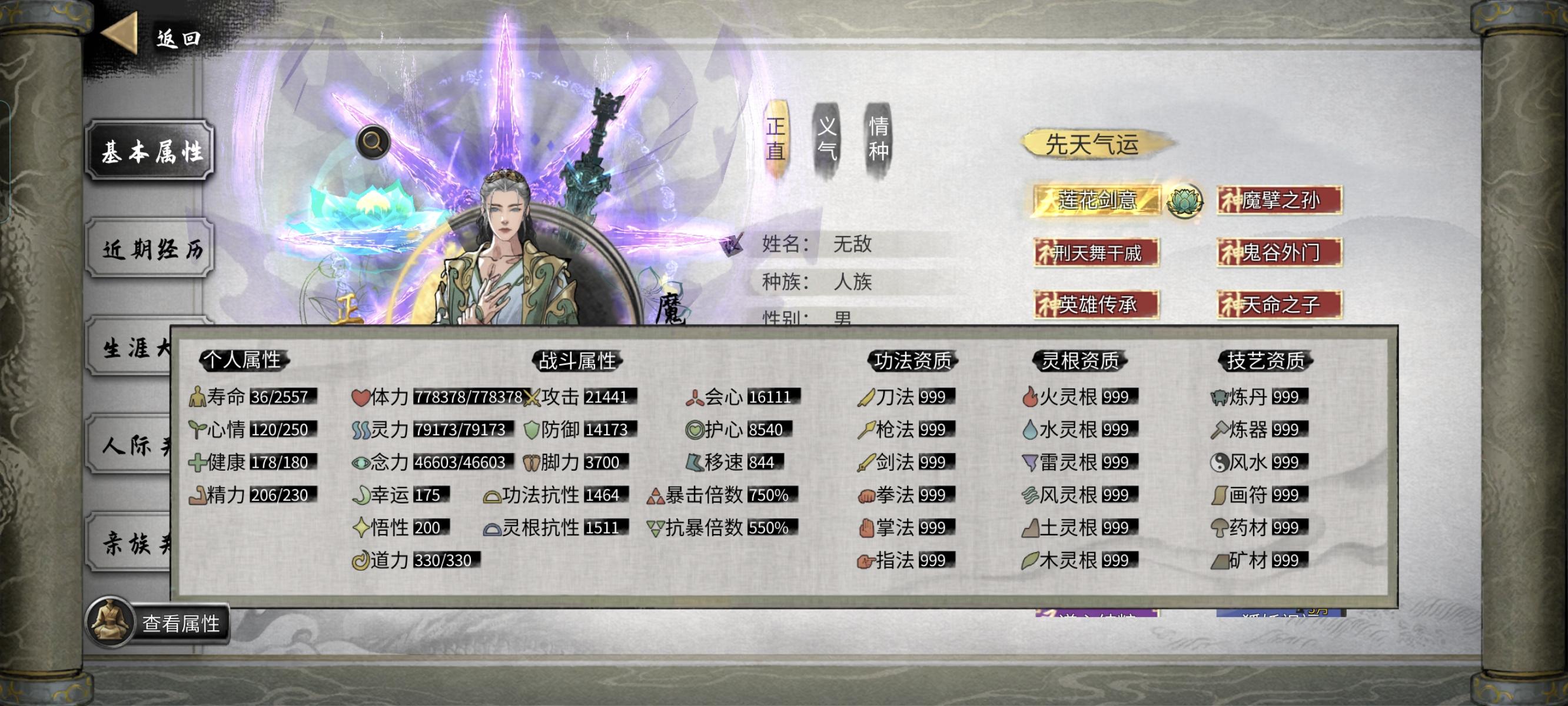 ★手游插件开满 (不开会很肝很肝)★洪荒开局(但是记得存档,死亡一次要回档,否则会被强行删档,只能重开。基本拿了噬魂剑,和天香的“帝花道君”游戏就变简单了。实在没信心可以选普通玩,其他难度不建议)★建议选最多NPC的选项 ,更多互动,也方便找Bug功法★天命气运介绍:★青莲剑仙:产生各种功能的莲子,强在资源获取,伴生技能需要配合剑系功法。主要是再也不缺复活药了,不需要为了亲友去学什么三生九