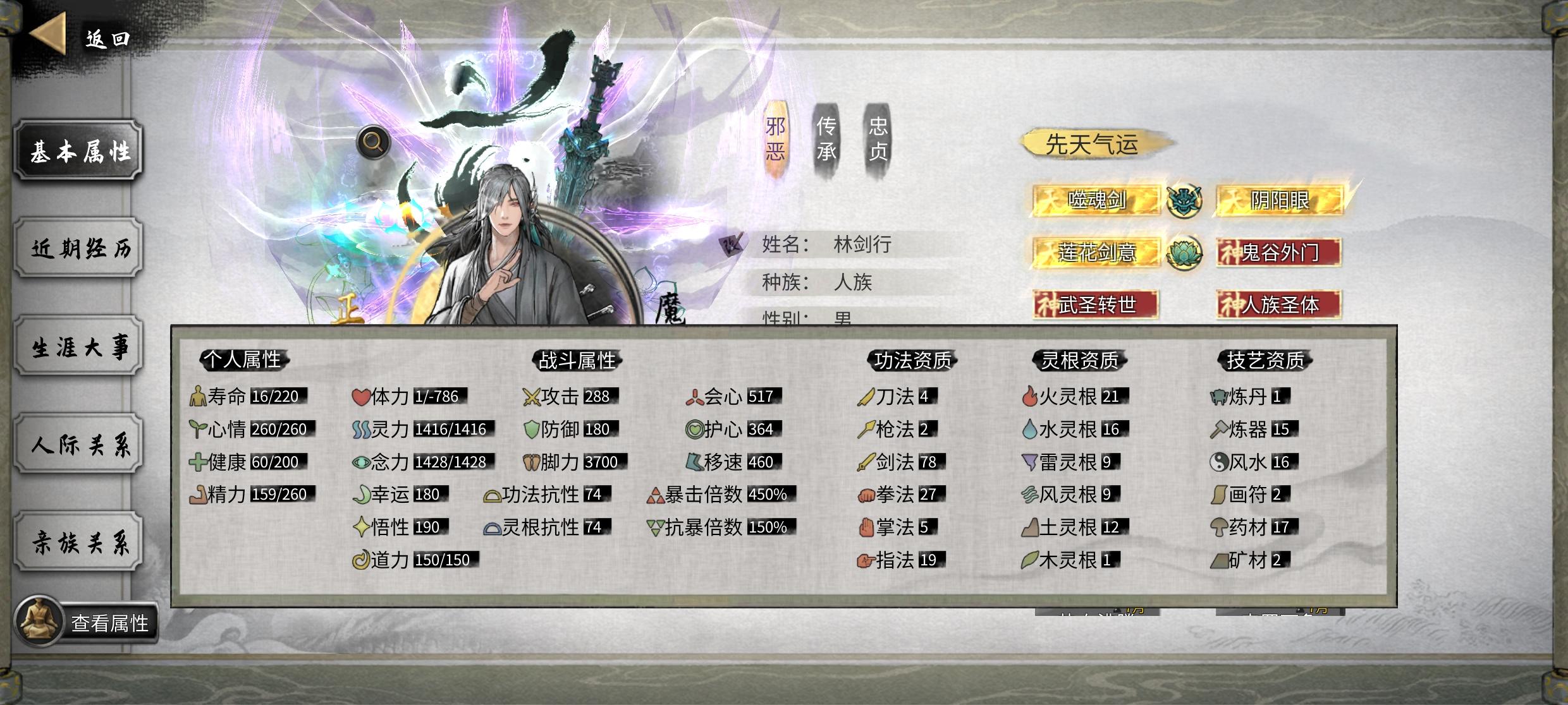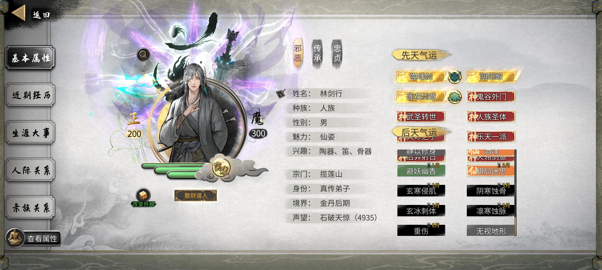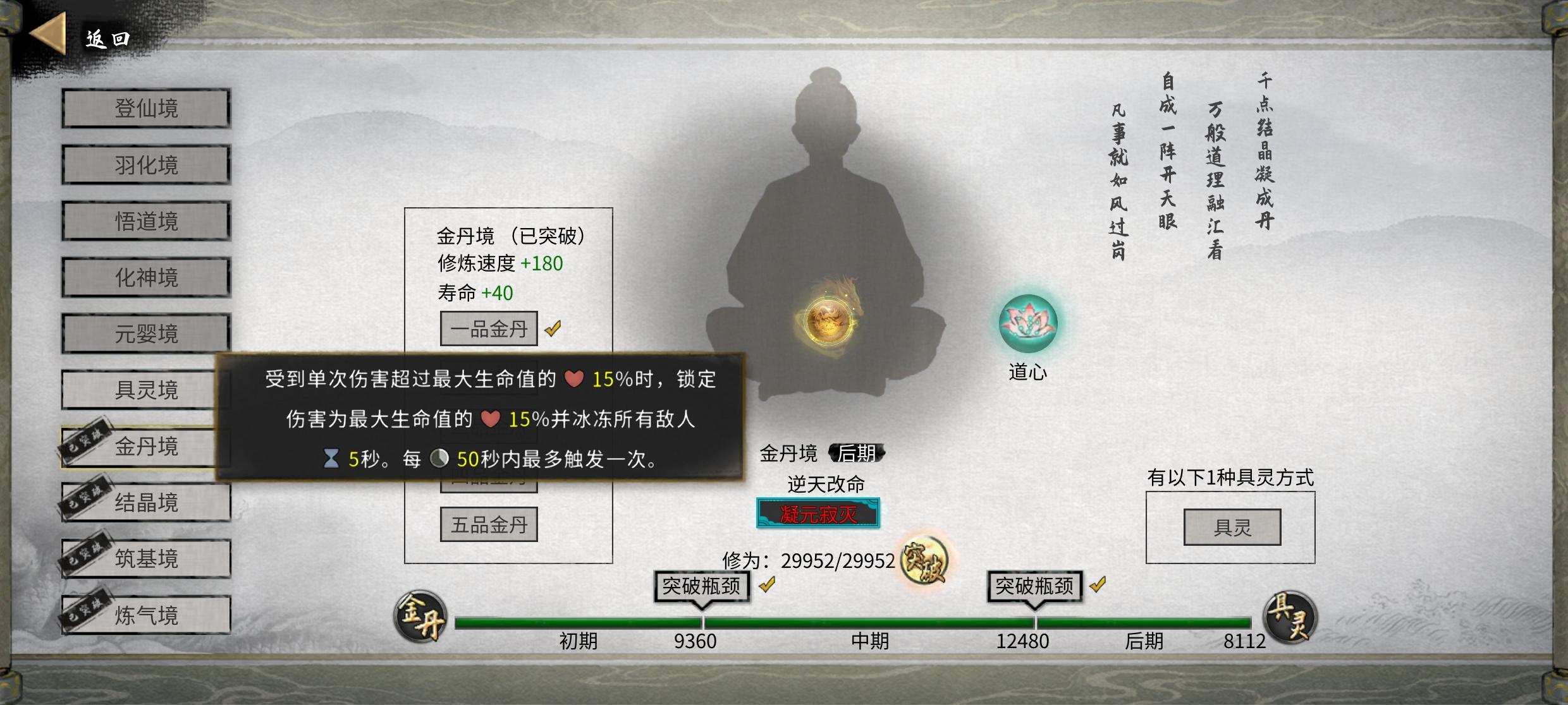 需要五朵金花DLC,霜凌的负面buff,以及重伤,可以走在海上让何罗鱼打如图显示,我的血量为一点或者负血,那么搭配凝元寂灭这个逆天改命,等同于无敌我什么技能都没学,就用人物送的搭配噬魂剑,直接站撸,还可以无敌两三个月