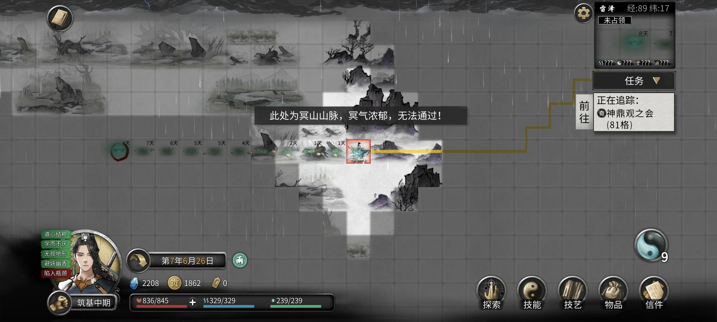 我想去完成上面这个神鼎观之会的任务,但是无论从哪边走都有名山山脉拦截过不去。请问有什么解决方法吗?是要突破到结丹才行吗