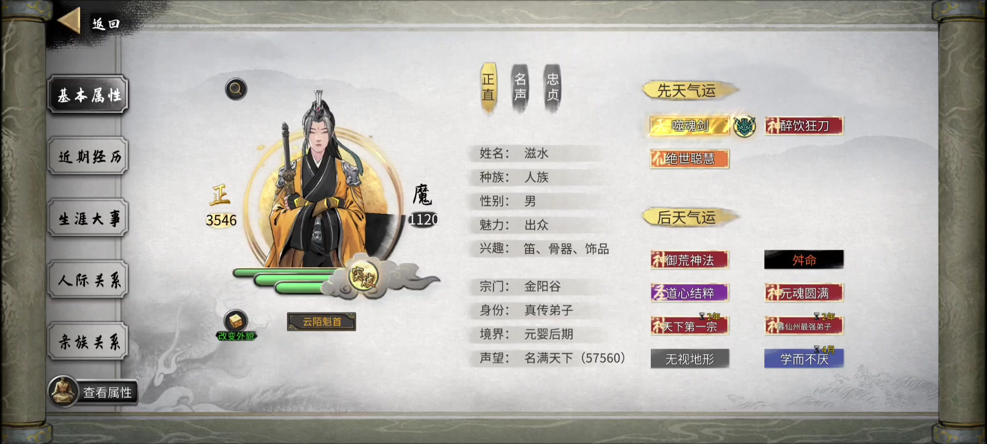 鬼谷八荒你害我半夜难过的睡不着!游戏初期,因为名字好听加入了揽云教。和别人交流老是道不同,我才发现这竟是个魔教。一股正义感油然而生,我当即立下宏愿:定要当上宗主,拨乱反正!为了晋升真传,我按照游戏机制,拜了**连春娇**为师。可我的仁善立场与她的狂邪性格,格格不入。每一次对话,看着屏幕上跳出“*亲密度下降*的提示,我的心都跟着沉一下。经过漫长的经营,我终于在*结晶后期*成功继任宗主,并将宗门立