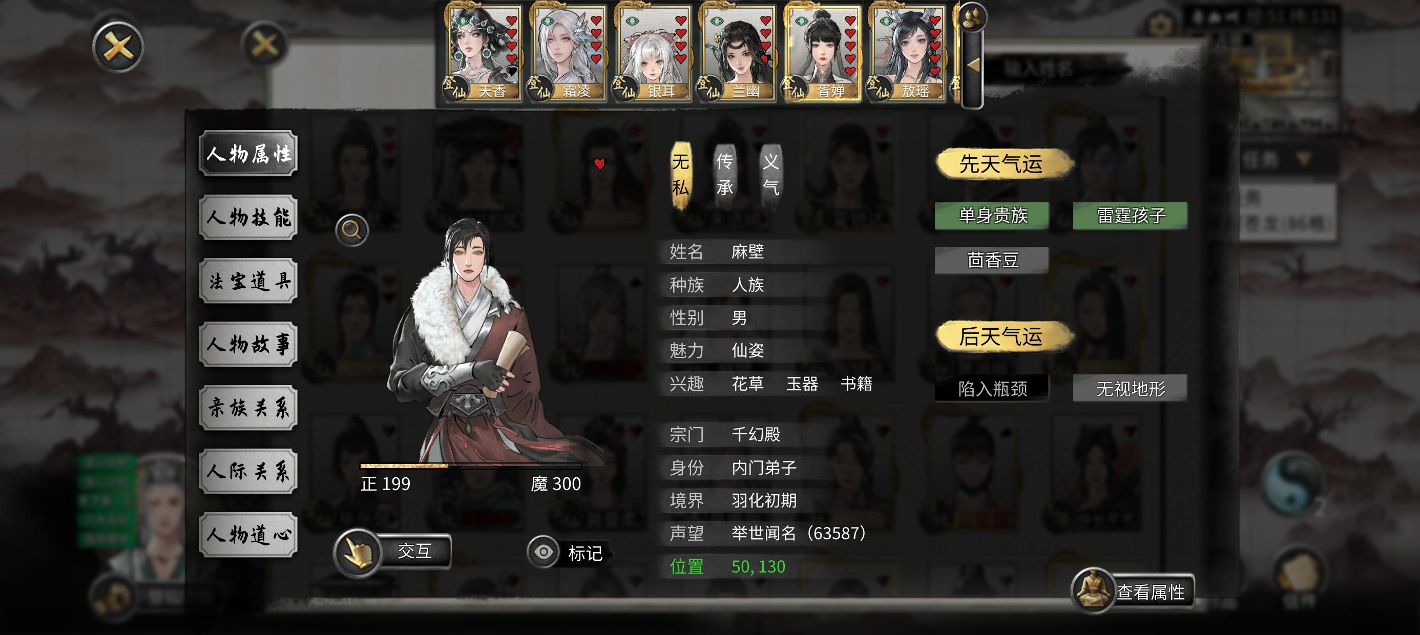 ★手游插件开满 (不开会很肝很肝)★洪荒开局(但是记得存档,死亡一次要回档,否则会被强行删档,只能重开。基本拿了噬魂剑,和天香的“帝花道君”游戏就变简单了。实在没信心可以选普通玩,其他难度不建议)★建议选最多NPC的选项 ,更多互动,也方便找Bug功法★天命气运介绍:★青莲剑仙:产生各种功能的莲子,强在资源获取,伴生技能需要配合剑系功法。主要是再也不缺复活药了,不需要为了亲友去学什么三生九