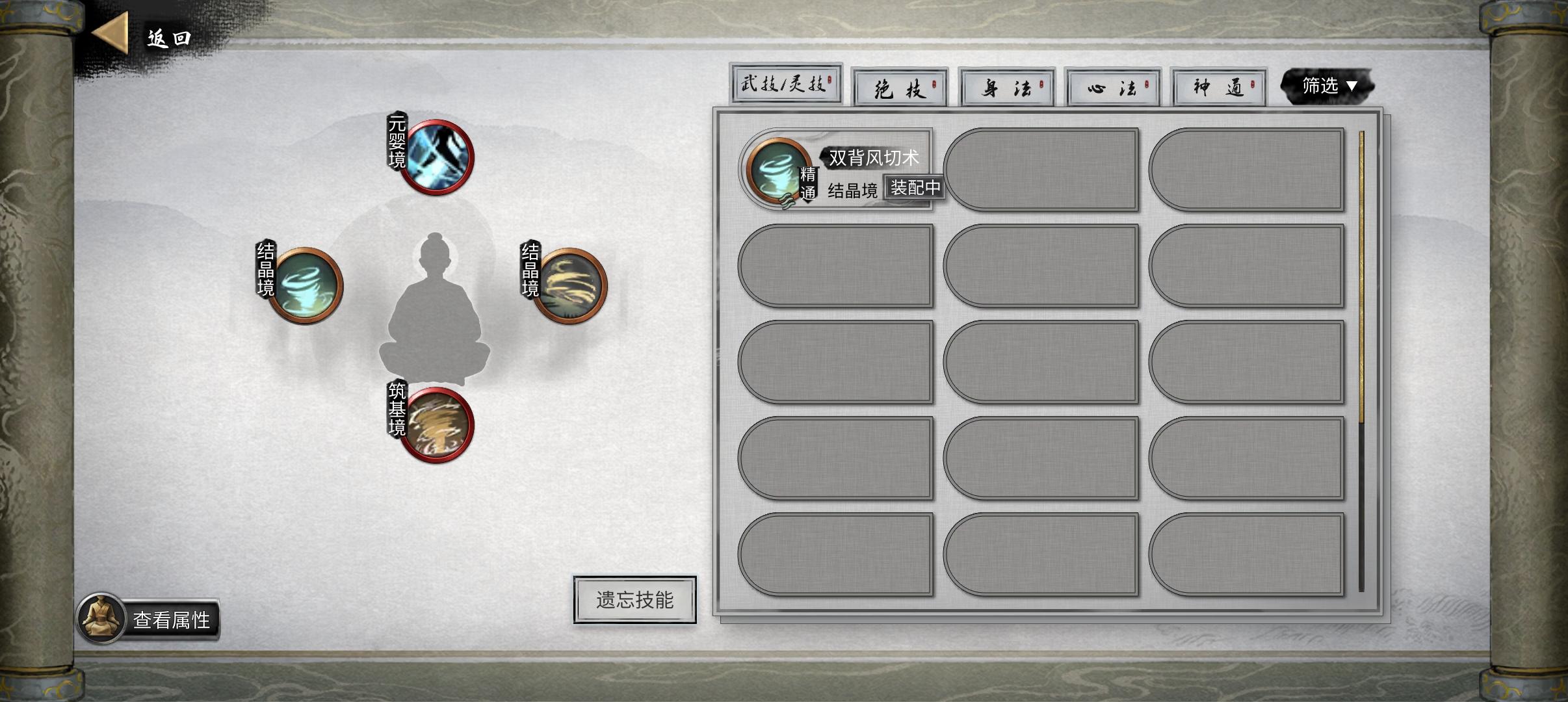 武技:清风剑(减CD,流血,穿透)绝技:绝影剑(绝影剑数量,场上存在流血绝影剑数量,冷却,引爆流血减身法CD,减少灵力消耗)身法:御剑术(御剑时武技冷却,御剑时武技伤害,御剑时提升移速)神通:骤天剑(引爆剑影无敌,冷却)劲:血加攻击,资质加攻击,绝技加百分比伤,攻击次数加百分比伤。(攻击力和加百分比伤五五开最好)传承渡江云。经:药材资质给血,功法资质给血,身法回血,己方单位消失回血,武技