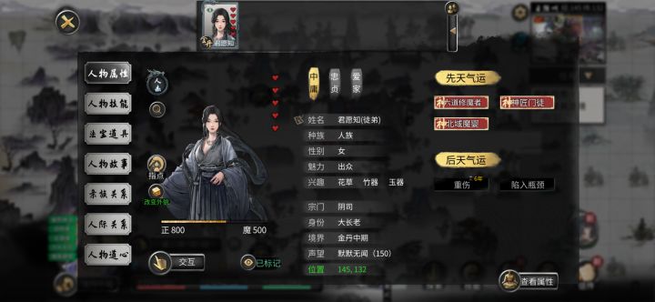 开始前准备,插件全开,选择洪荒模式,NPC数量较多(更好的刷到厉害的NPC) 先天气运必备:阴阳眼、大能转世 性格推荐:忠贞(好结道侣),传承(好拜师),中庸(对所有人都一样) 剑,风灵根资质尽量高(节省SL灵果时间) 神器选择:双鱼佩 1.进游戏先确认阴阳眼是否能正常触发(保证后续镇妖魂能正常触发,触发了其他的魂要回档,确保镇妖魂能稳定触发两次) 2.零步大法(走完零天的步数后保存,