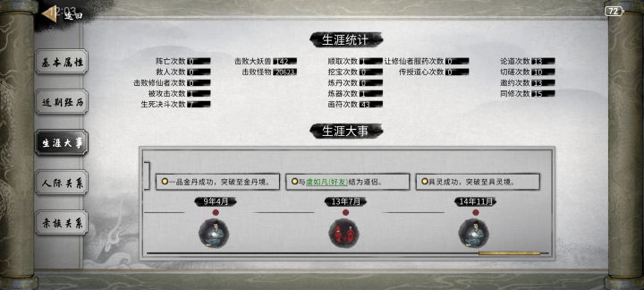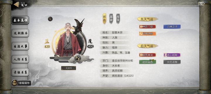 开始前准备,插件全开,选择洪荒模式,NPC数量较多(更好的刷到厉害的NPC) 先天气运必备:阴阳眼、大能转世 性格推荐:忠贞(好结道侣),传承(好拜师),中庸(对所有人都一样) 剑,风灵根资质尽量高(节省SL灵果时间) 神器选择:双鱼佩 1.进游戏先确认阴阳眼是否能正常触发(保证后续镇妖魂能正常触发,触发了其他的魂要回档,确保镇妖魂能稳定触发两次) 2.零步大法(走完零天的步数后保存,