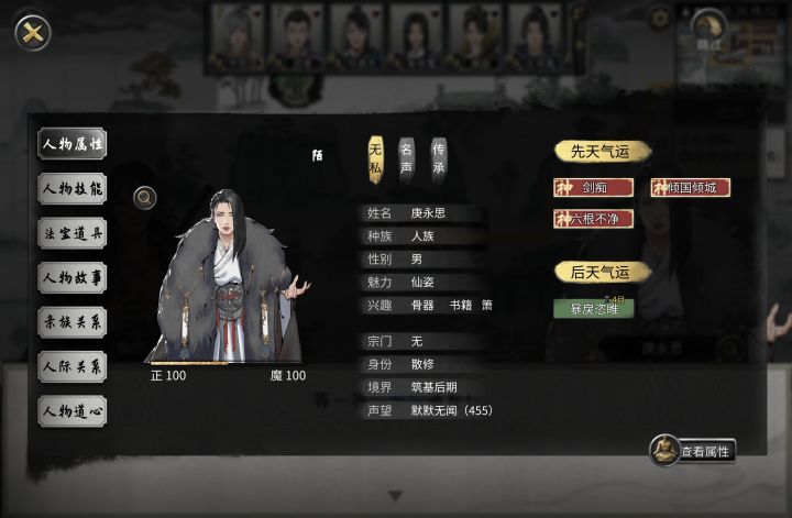 性格:开局性格选择仁善/中庸,➕忠贞传承。好人性格,方便结交好友,结缔亲族关系,还不至于无私那种烂好人,过月麻烦多。