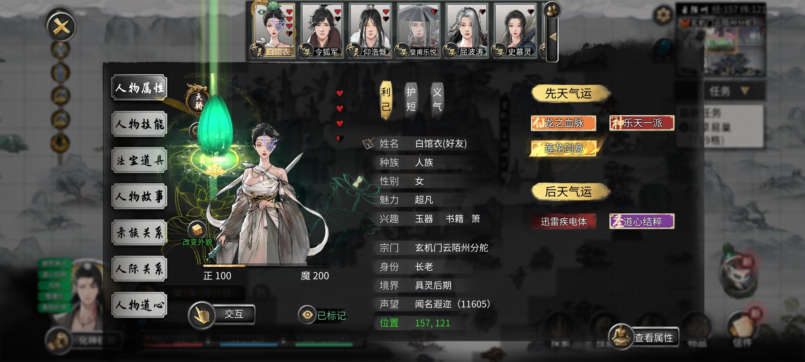 ★手游插件开满 (不开会很肝很肝)★洪荒开局(但是记得存档,死亡一次要回档,否则会被强行删档,只能重开。基本拿了噬魂剑,和天香的“帝花道君”游戏就变简单了。实在没信心可以选普通玩,其他难度不建议)★建议选最多NPC的选项 ,更多互动,也方便找Bug功法★天命气运介绍:★青莲剑仙:产生各种功能的莲子,强在资源获取,伴生技能需要配合剑系功法。主要是再也不缺复活药了,不需要为了亲友去学什么三生九