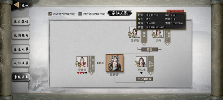 第二张图是我师傅的。我有两个徒弟,一男一女,是一对夫妻,男的是阴阳眼,我从金丹拉扯到登仙看着长大的,女的属于是一人得道鸡犬升天,看着男徒弟的面子也就收下当了徒弟。同时我有个师傅,我的火身法是金丹时期向她拜师学的,出于感谢我也给她拉到了登仙。再同时我还有个丈夫,是剧情那个三阴绝脉体,我第一次遇到,所以后面好了之后就和他结了夫妻。关系开始乱了,男徒弟进步神速,女徒弟化神的时候他元婴,现在女徒弟