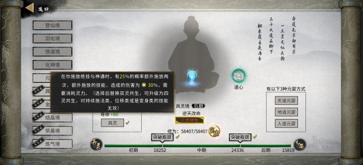 #鬼谷八荒 等了好几年终于等到五个老婆都登仙了,不得不说小迷妹修炼真慢,到现在都才具灵境,飞升的结局有点看不懂,这是失败了吗,到后面我才发现仙法还能这样装备(最后有图),运转贼快强得一批,还有李四的仙法是真的牛逼