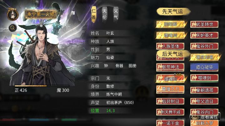 开始前准备,插件全开,选择洪荒模式,NPC数量较多(更好的刷到厉害的NPC) 先天气运必备:阴阳眼、大能转世 性格推荐:忠贞(好结道侣),传承(好拜师),中庸(对所有人都一样) 剑,风灵根资质尽量高(节省SL灵果时间) 神器选择:双鱼佩 1.进游戏先确认阴阳眼是否能正常触发(保证后续镇妖魂能正常触发,触发了其他的魂要回档,确保镇妖魂能稳定触发两次) 2.零步大法(走完零天的步数后保存,