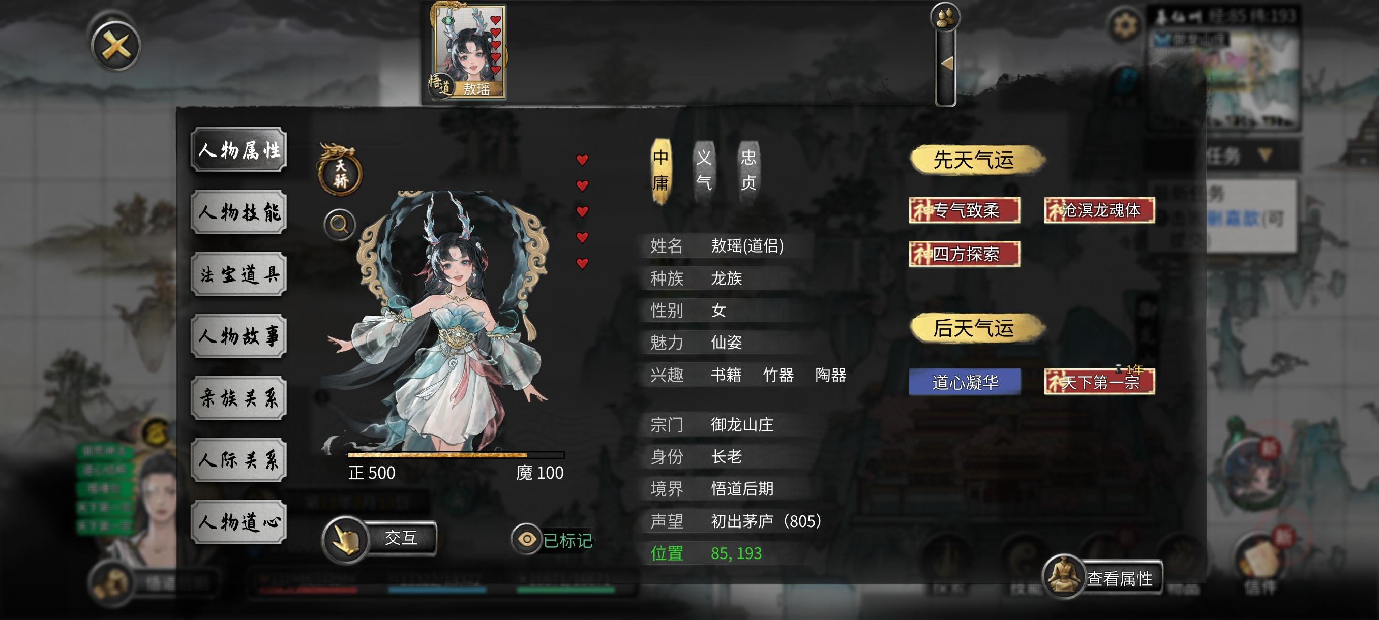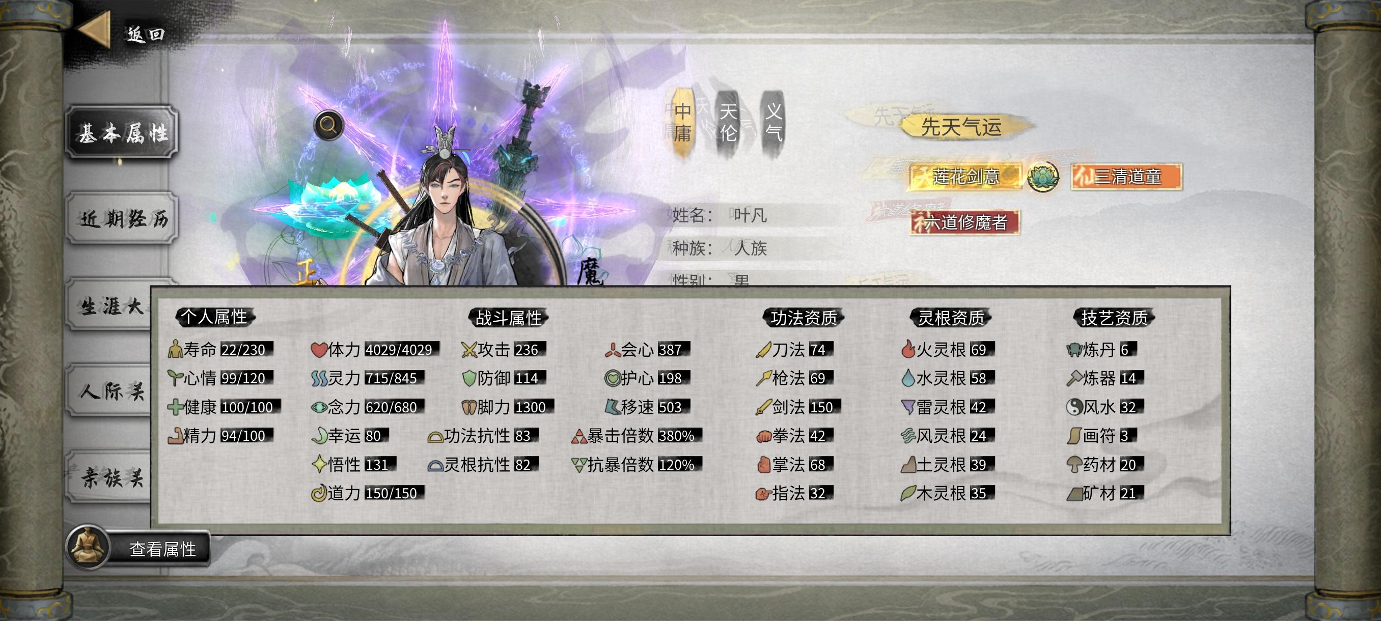 ★手游插件开满 (不开会很肝很肝)★洪荒开局(但是记得存档,死亡一次要回档,否则会被强行删档,只能重开。基本拿了噬魂剑,和天香的“帝花道君”游戏就变简单了。实在没信心可以选普通玩,其他难度不建议)★建议选最多NPC的选项 ,更多互动,也方便找Bug功法★天命气运介绍:★青莲剑仙:产生各种功能的莲子,强在资源获取,伴生技能需要配合剑系功法。主要是再也不缺复活药了,不需要为了亲友去学什么三生九