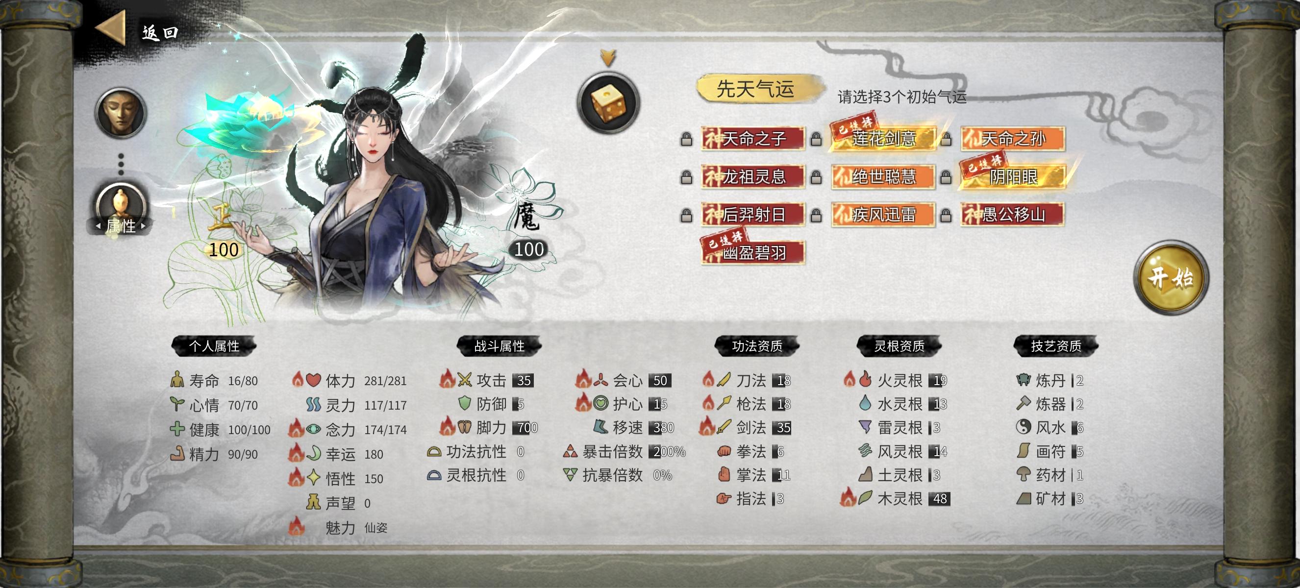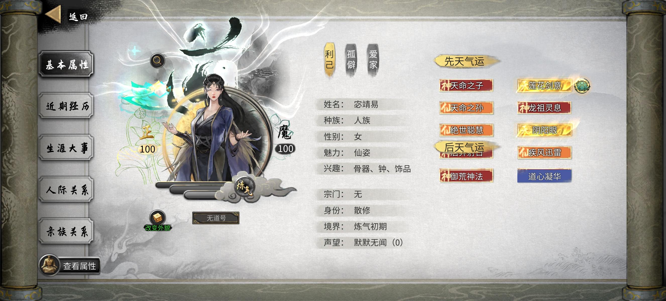 ★手游插件开满 (不开会很肝很肝)★洪荒开局(但是记得存档,死亡一次要回档,否则会被强行删档,只能重开。基本拿了噬魂剑,和天香的“帝花道君”游戏就变简单了。实在没信心可以选普通玩,其他难度不建议)★建议选最多NPC的选项 ,更多互动,也方便找Bug功法★天命气运介绍:★青莲剑仙:产生各种功能的莲子,强在资源获取,伴生技能需要配合剑系功法。主要是再也不缺复活药了,不需要为了亲友去学什么三生九