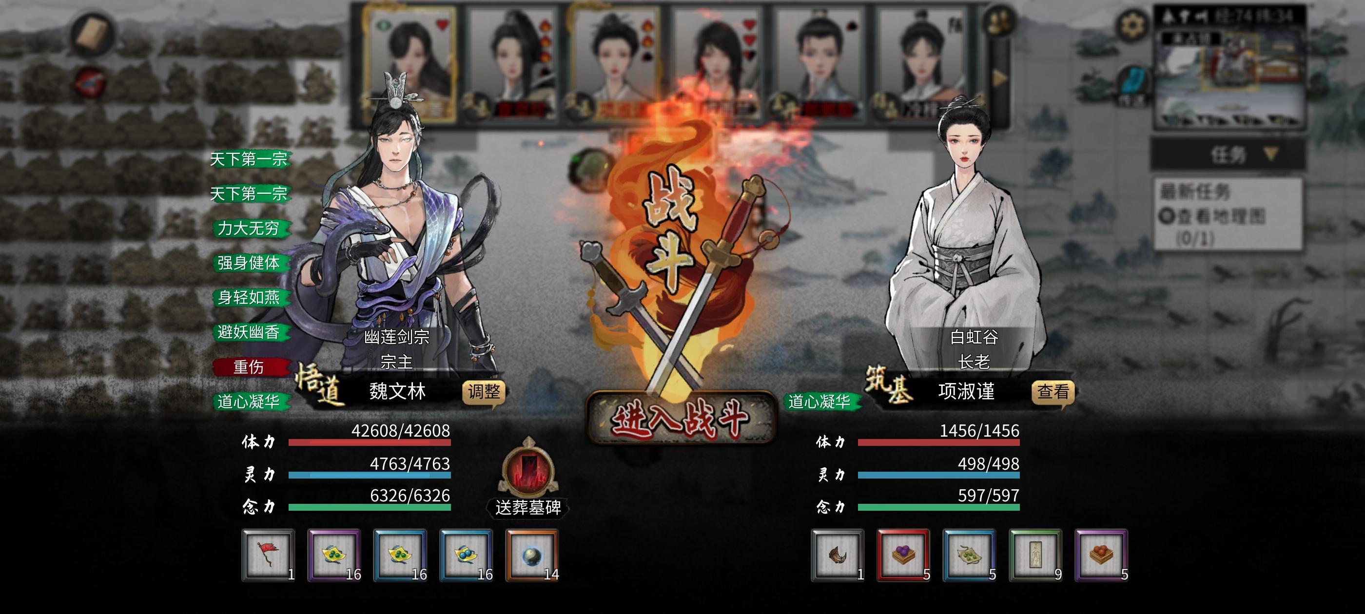 ★手游插件开满 (不开会很肝很肝)★洪荒开局(但是记得存档,死亡一次要回档,否则会被强行删档,只能重开。基本拿了噬魂剑,和天香的“帝花道君”游戏就变简单了。实在没信心可以选普通玩,其他难度不建议)★建议选最多NPC的选项 ,更多互动,也方便找Bug功法★天命气运介绍:★青莲剑仙:产生各种功能的莲子,强在资源获取,伴生技能需要配合剑系功法。主要是再也不缺复活药了,不需要为了亲友去学什么三生九